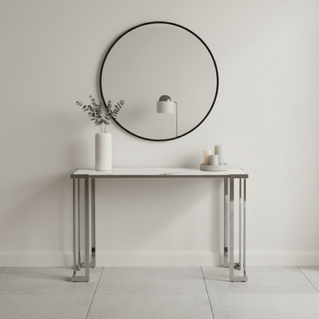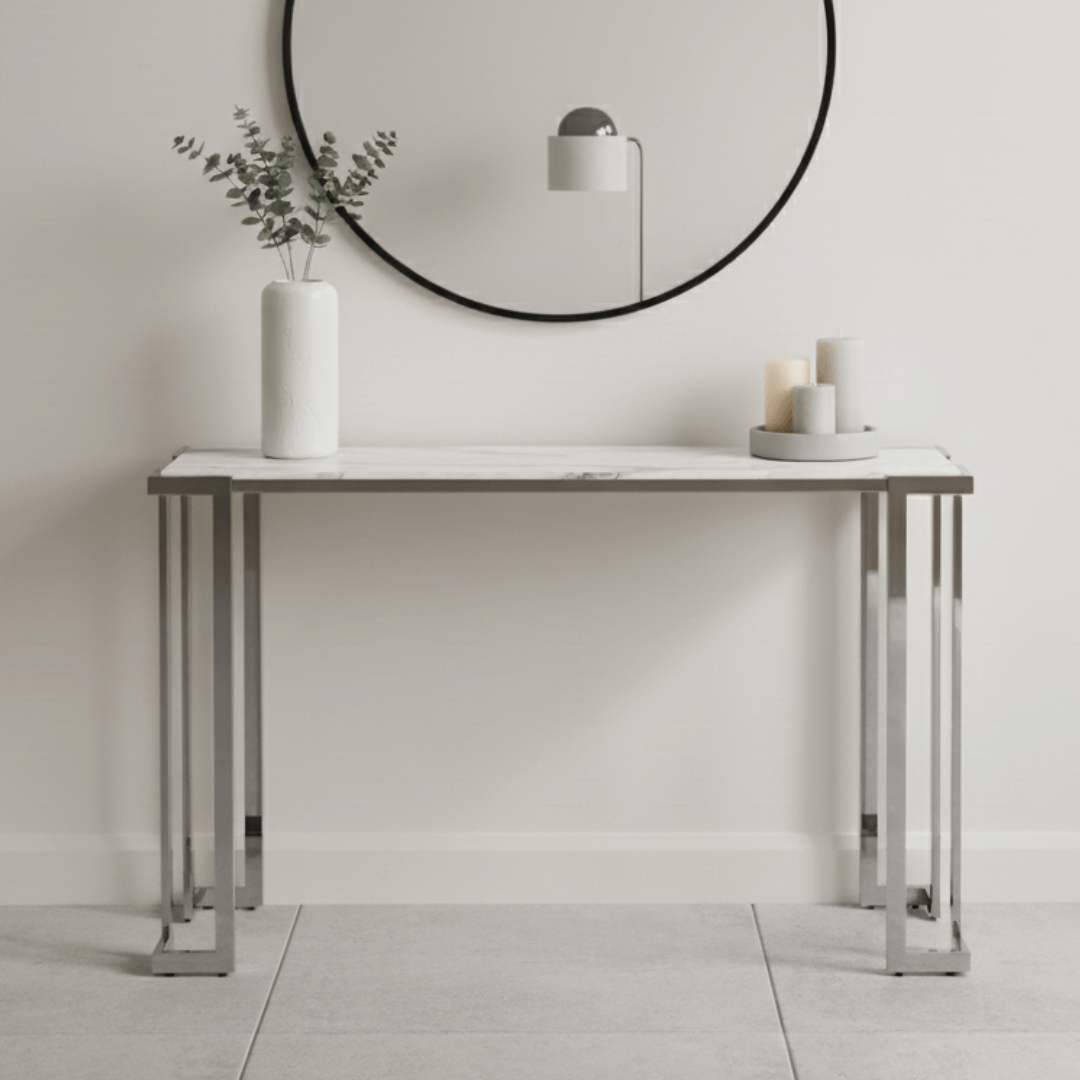 Introducing the exceptional Sepano Marble Glass Console Table with Gunmetal Stainless Steel—an embodiment of sophistication and contemporary design, meticulously curated to elevate your interior space. This remarkable piece boasts an array of captivating features that seamlessly fuse style with practicality. With the Sepano Marble Glass Console Table with Gunmetal Stainless Steel, you're not just getting furniture; you're embracing a masterpiece that embodies elegance, innovation, and artistic finesse. Redefine your living room with this exquisite creation that effortlessly marries beauty with function.