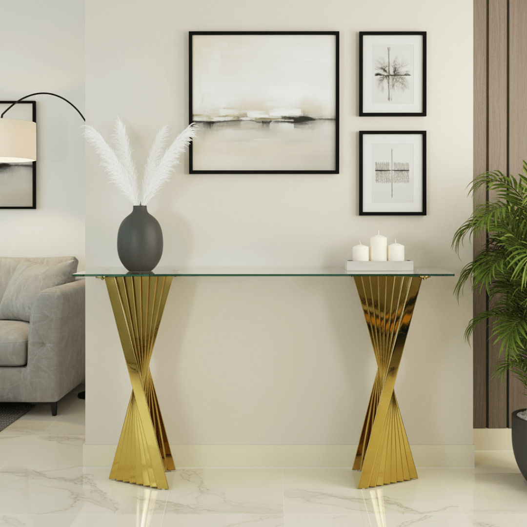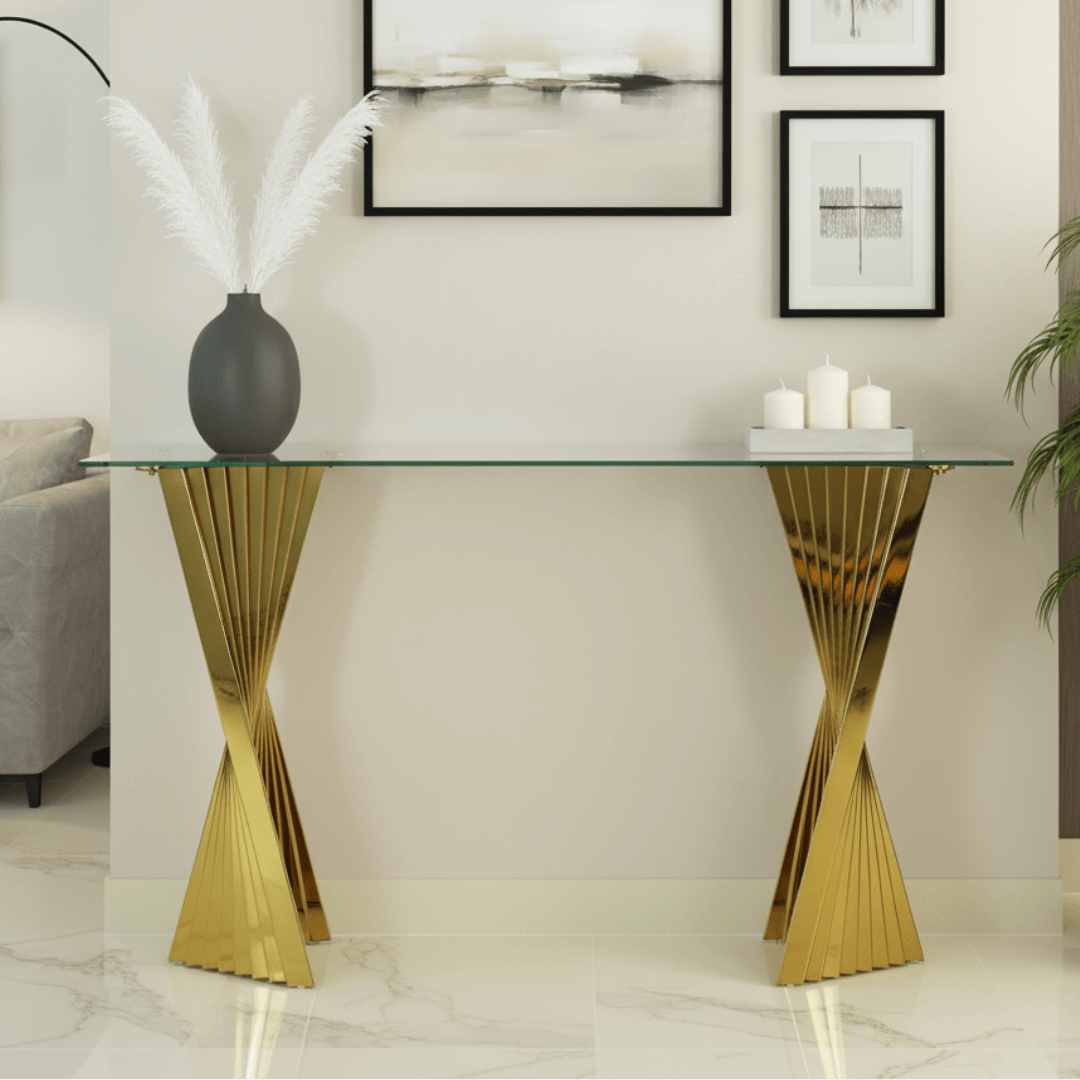 Introduce a touch of modern elegance to your home with the Sintra Gold Console Table. This exquisite piece combines sleek design with luxurious elements, making it an ideal addition to any contemporary space. The Sintra Console Table features a refined gold finish that adds a sense of opulence, while its minimalist design ensures versatility in various settings. Perfect for entryways, living rooms, or hallways, this console table offers both style and functionality. Use it to display your favorite decor, photos, or as a chic catch-all for keys and mail.