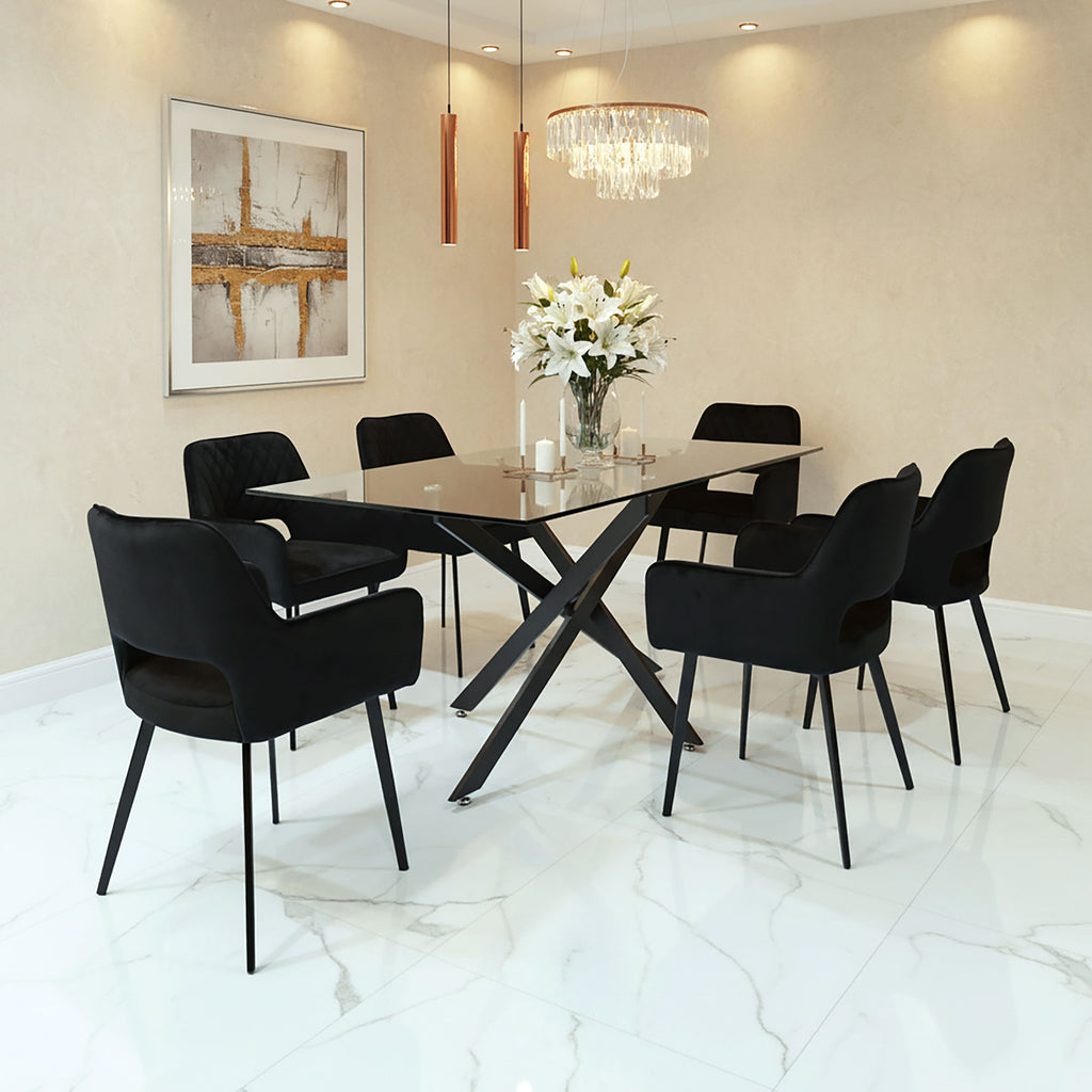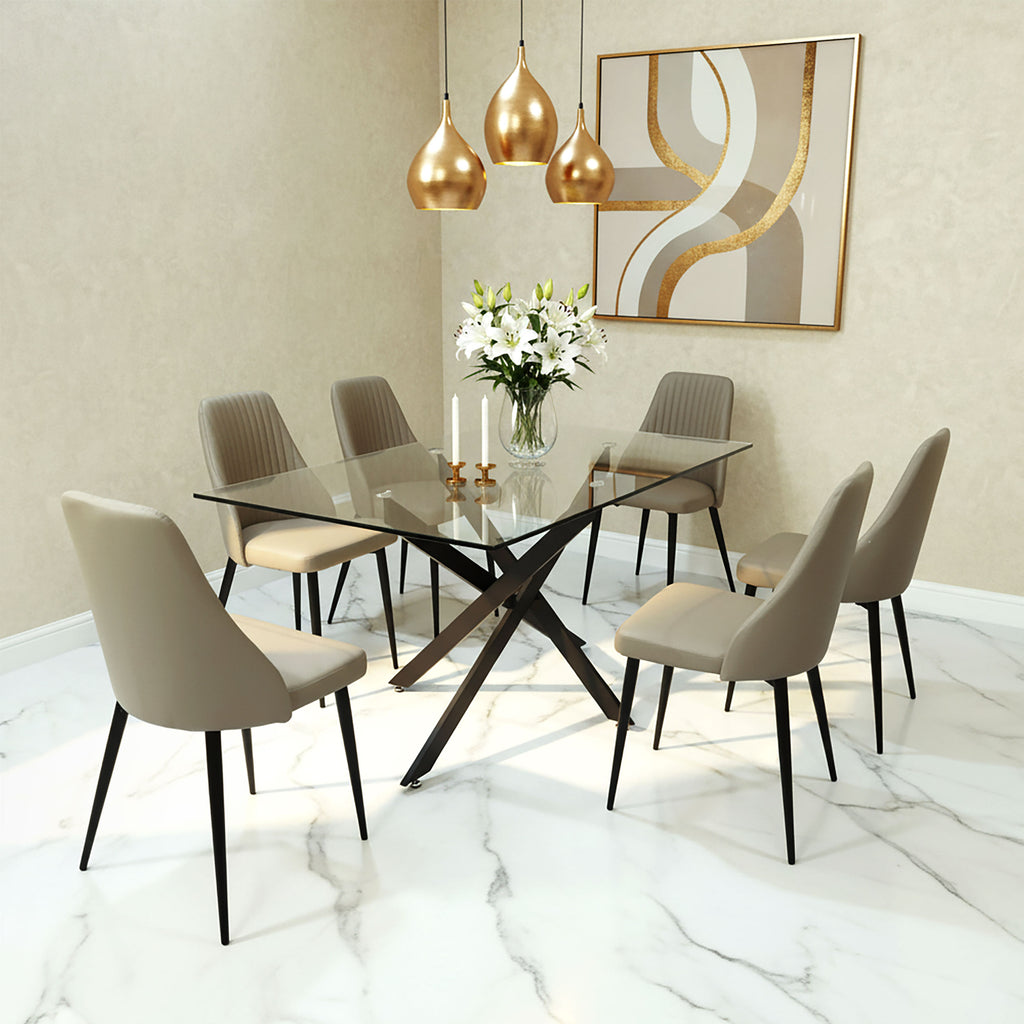 6 Seater Glass Dining Table Set – Davos Black Large with Misano Taupe Chairs