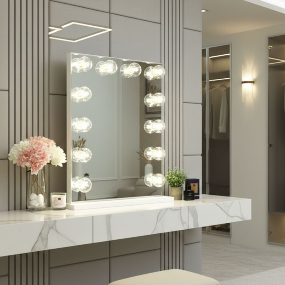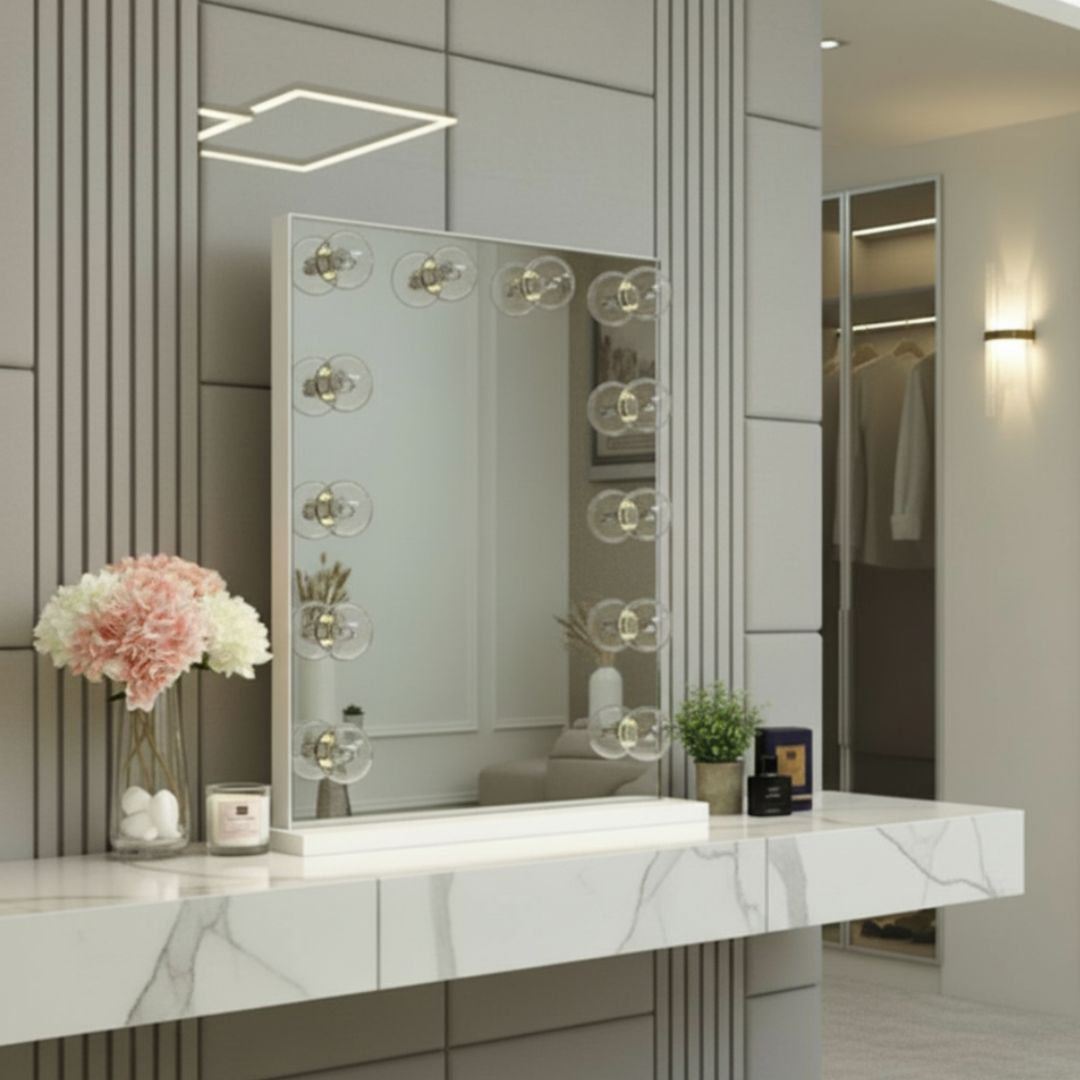 The mirror features a dimmable light that allows you to adjust the intensity of the bulbs to your liking, ensuring that you have the perfect lighting to look your best no matter what. The customizable lighting is essential for makeup application, hairstyling, and other beauty routines, and the mirror's high-quality reflection provides a clear and accurate image. The mirror is large enough to provide ample space for you to work on your look and is made with high-quality materials, ensuring its durability and longevity. The mirror is easy to assemble and can be mounted on the wall or used on a tabletop, providing versatility and flexibility for your space.