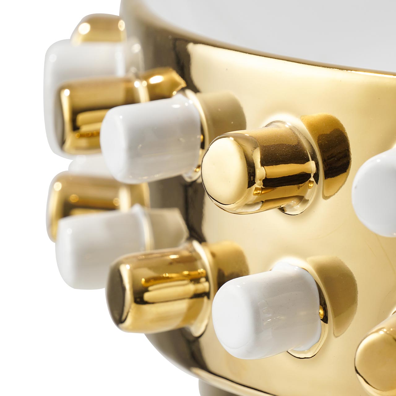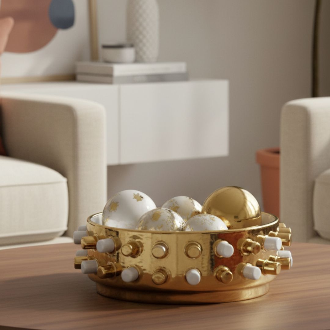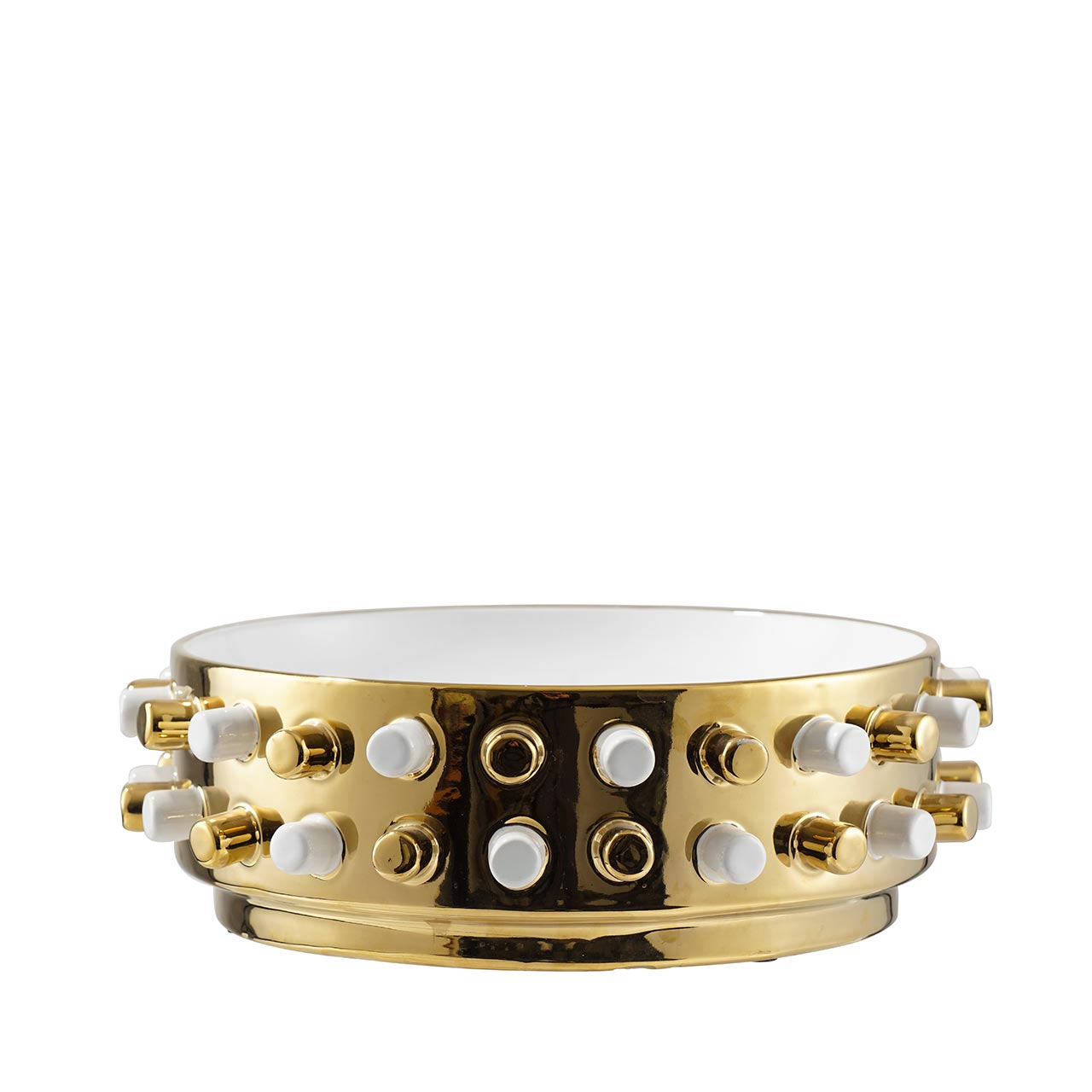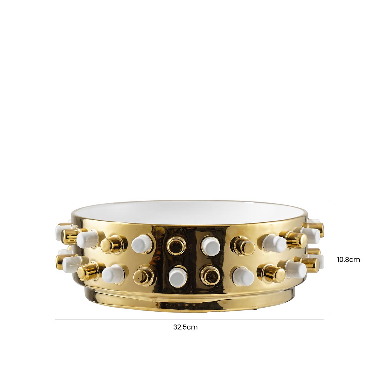 Add a touch of luxury to your décor with this 10.8cm gold and white studded ceramic dish. Its elegant design and shimmering gold accents make it a perfect tabletop or shelf accent. Ideal for holding small décor items or as a standalone piece, it brings sophistication and a contemporary charm to any space.