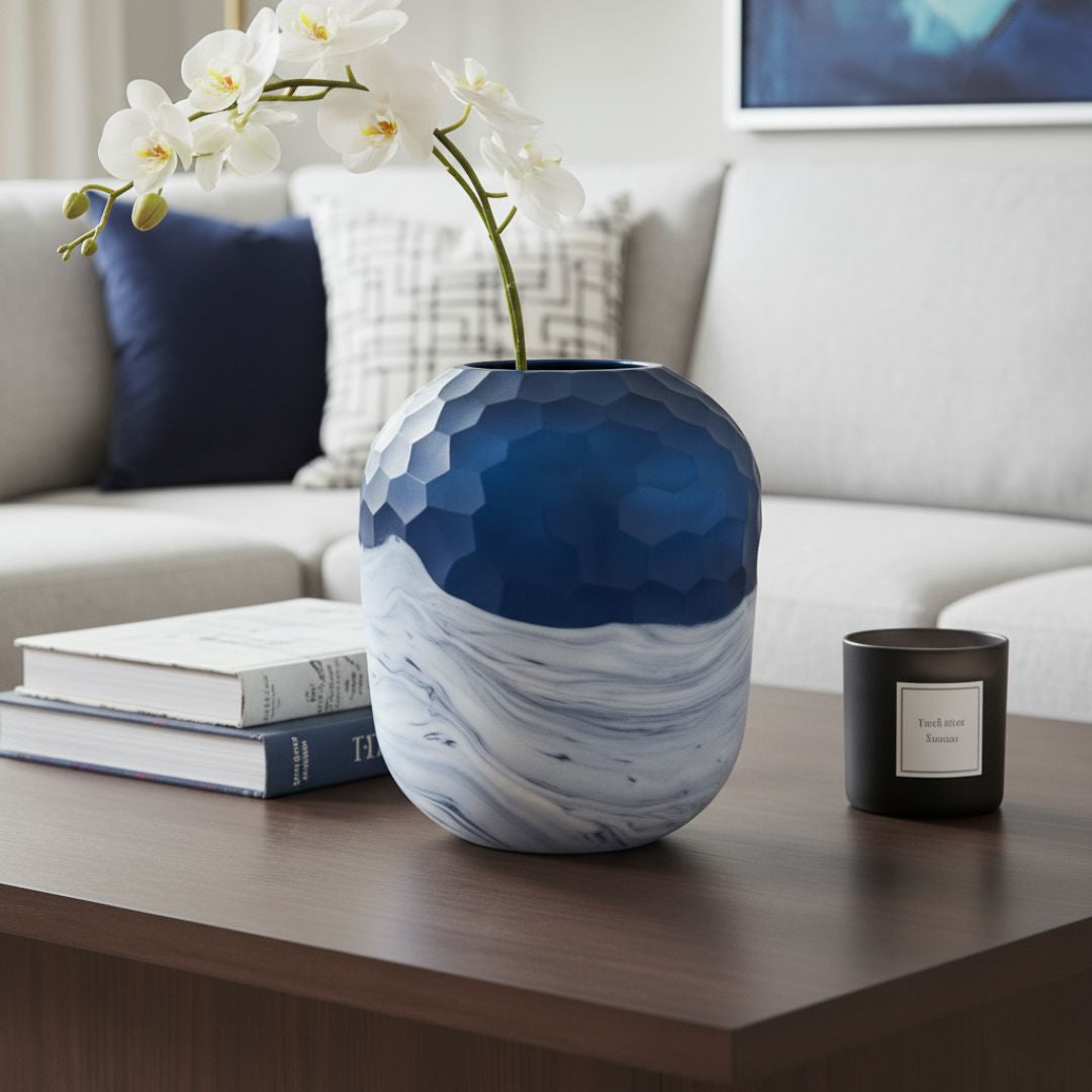 Add refined elegance to your décor with the 18.5cm Dark Blue and White Handmade Glass Vase from VANITY LIVING. Featuring a striking two-tone blend of deep blue and crisp white, this handcrafted glass vase is designed to elevate small spaces with subtle luxury. Its compact size makes it ideal for fresh flowers, pampas grass, dried stems, or minimalist styling. Perfect for living rooms, dining tables, bedrooms, or office desks, this artisan vase works beautifully as both a functional flower holder and a decorative accent. Each piece is handmade, giving it a unique character and timeless appeal.