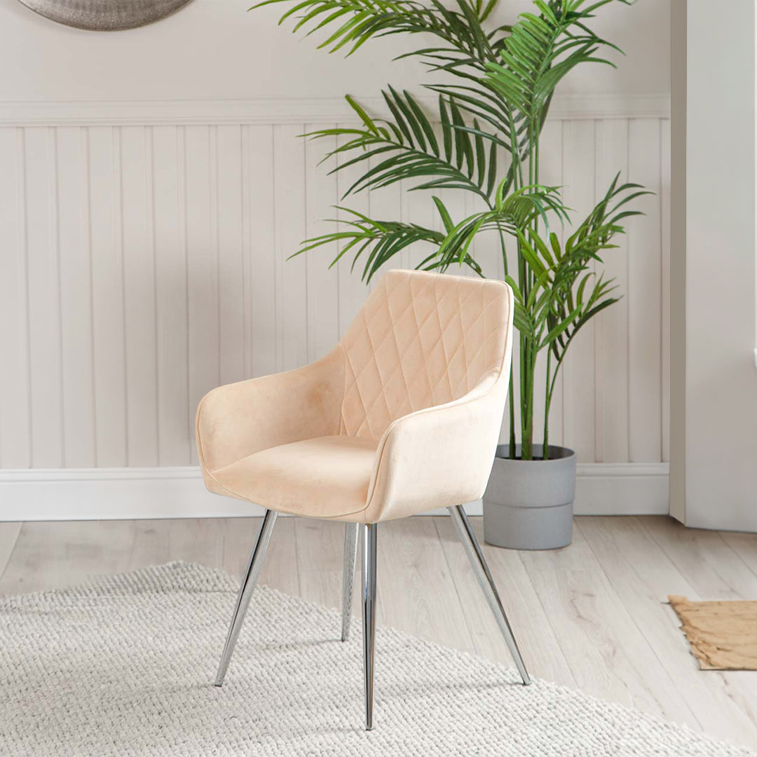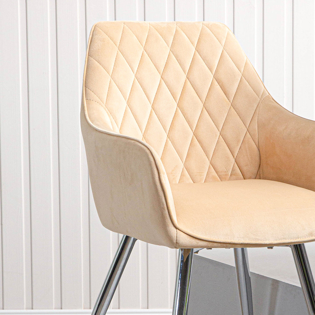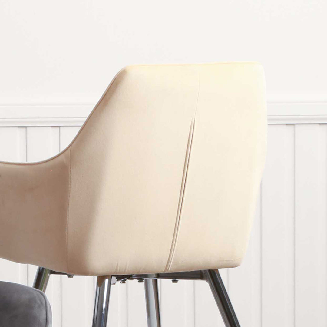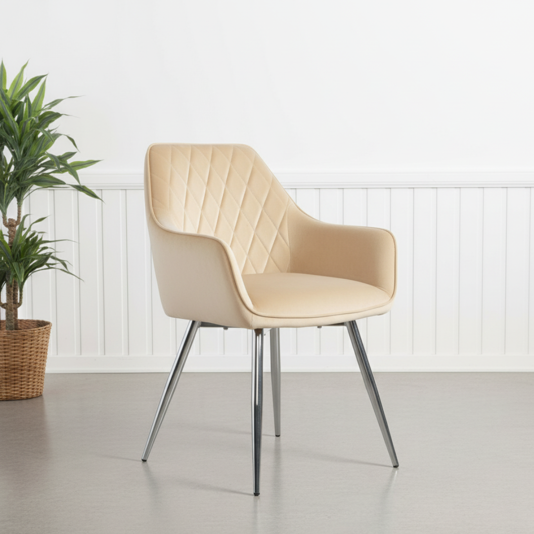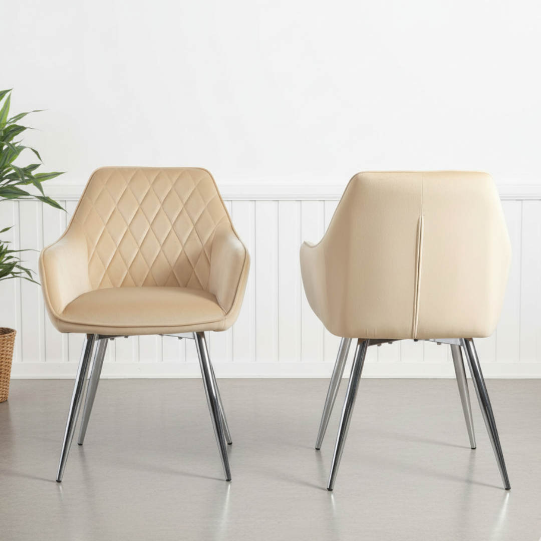 This set of chairs is designed for comfort with its wide seat, curved backrest, and comfortable armrests, making it perfect for long dinner parties or extended work sessions. The cream-colored upholstery adds a touch of modern elegance to any room, and its versatile design allows it to complement a variety of decor styles.