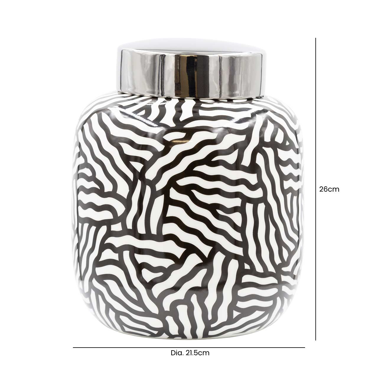 Add a refined decorative touch to your interior with this 26cm Black and White Ginger Jar. Featuring bold contrasting tones and a timeless silhouette, this elegant jar brings contemporary sophistication to shelves, consoles, side tables, or mantels. Whether styled as a standalone accent or paired within a curated décor arrangement, it enhances any space with classic charm and modern appeal.