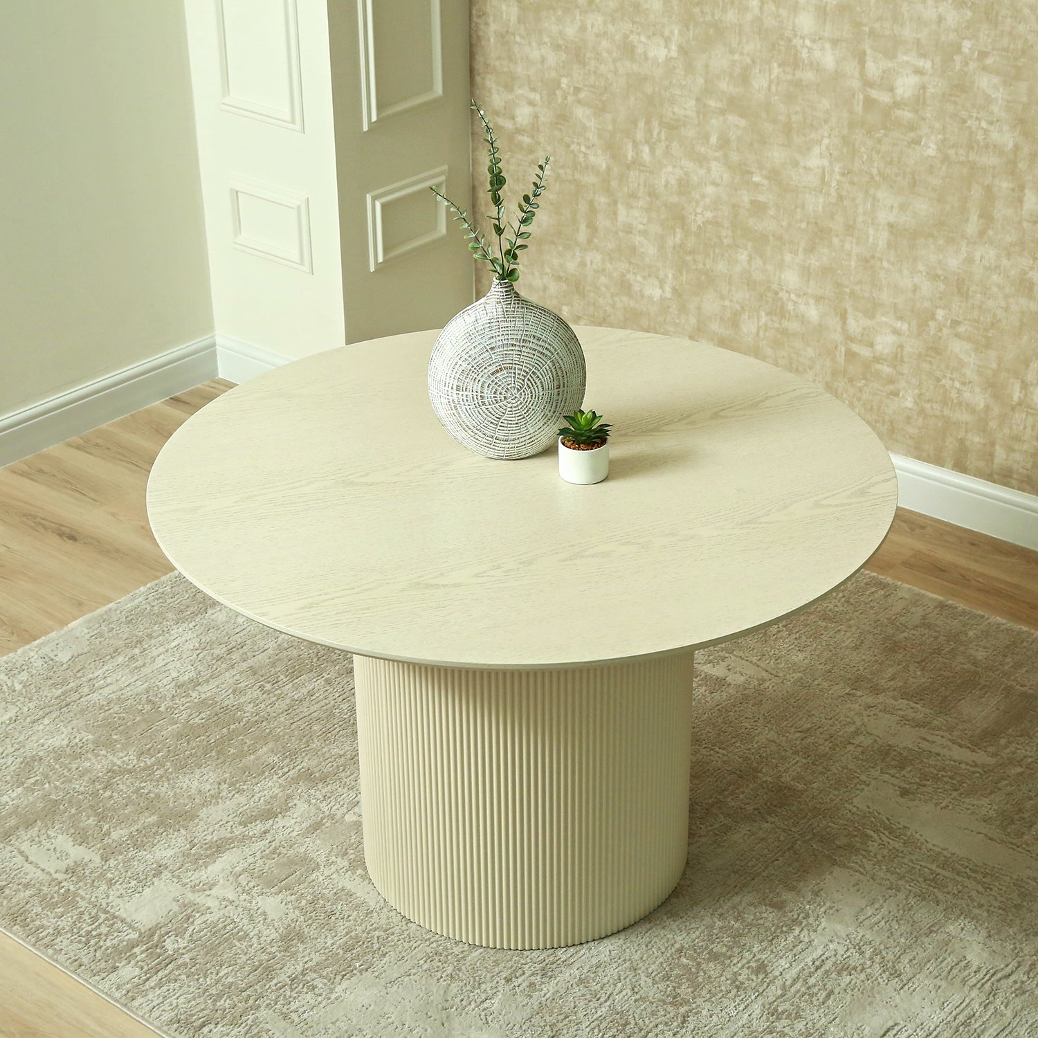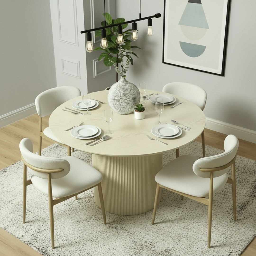 Create a warm and inviting dining atmosphere with the Modena Beige Wooden Round Dining Table Set, paired perfectly with Liguria Cream Dining Chairs. Designed for modern living, this elegant 4-seater set blends comfort, durability, and timeless style for everyday dining and special gatherings.