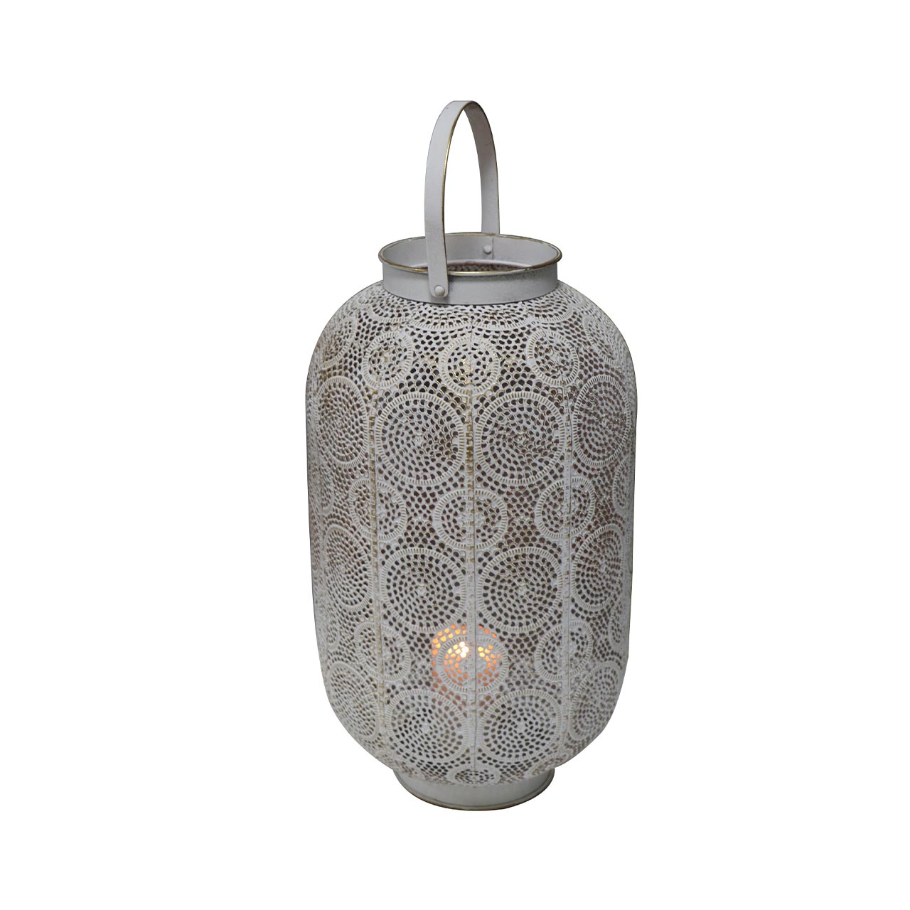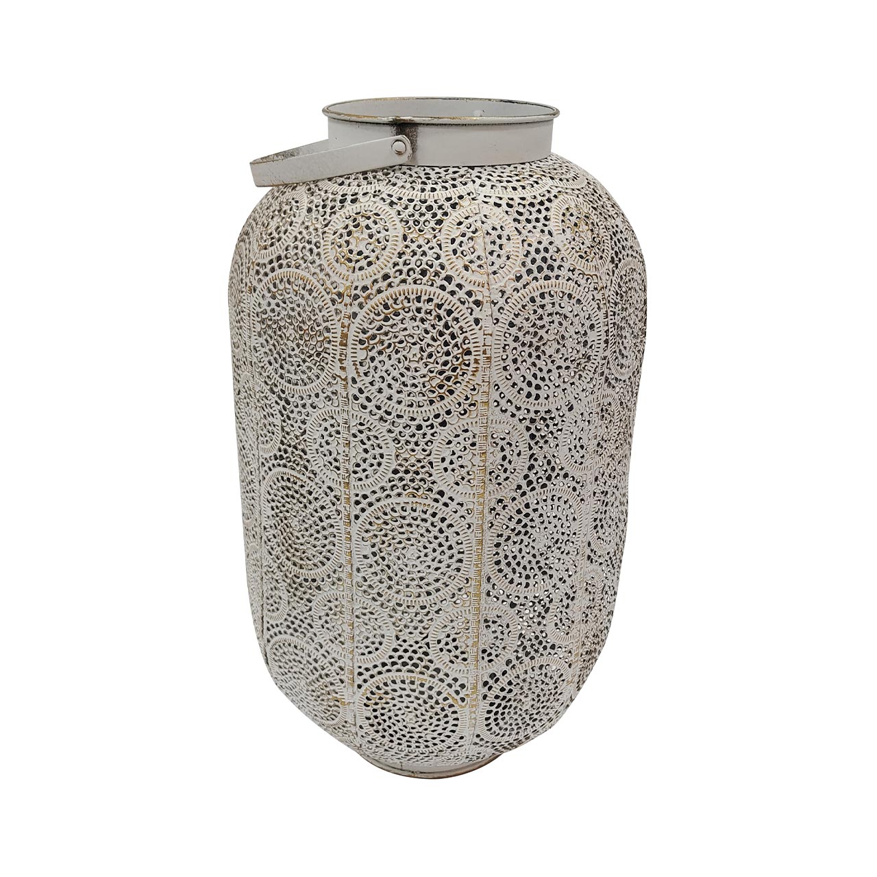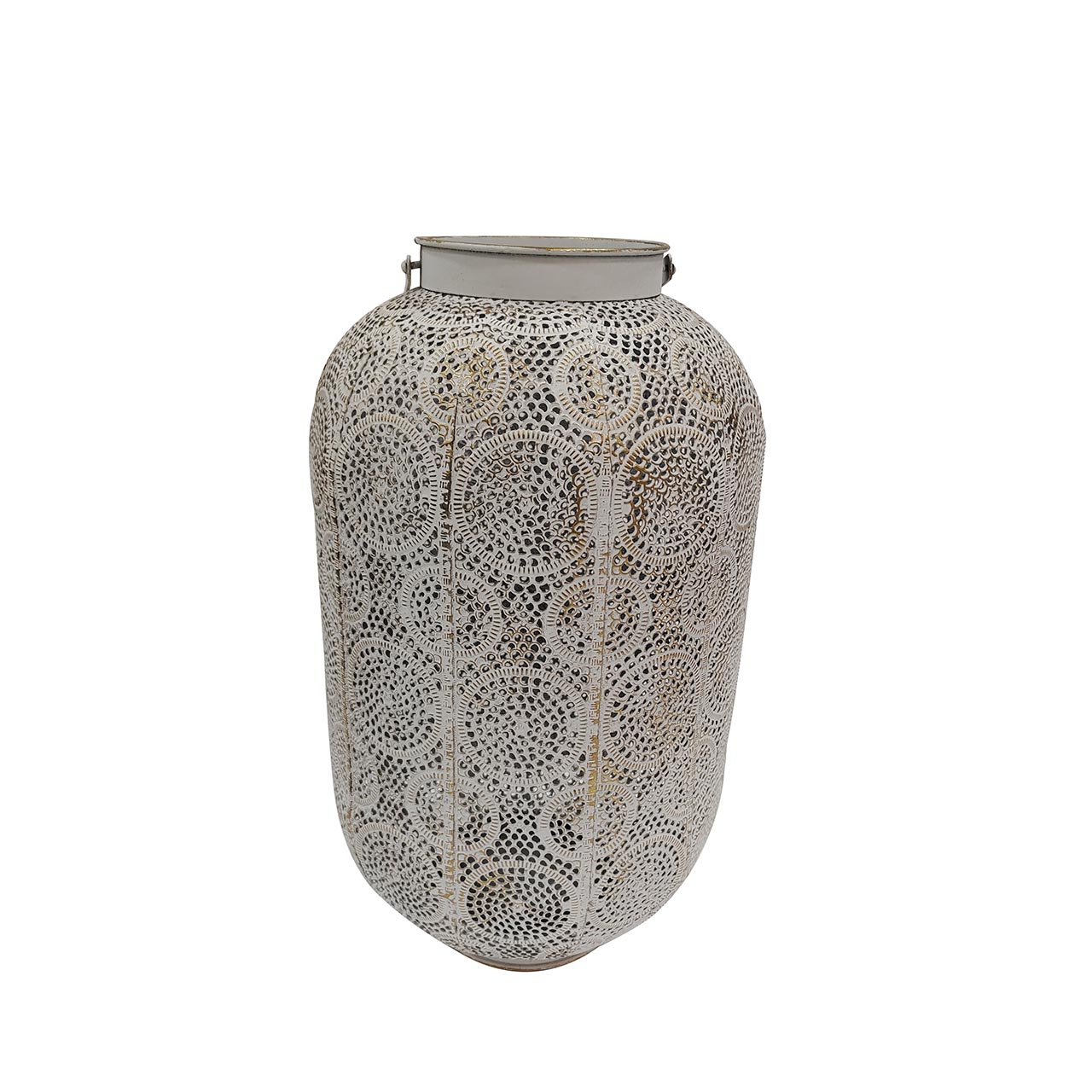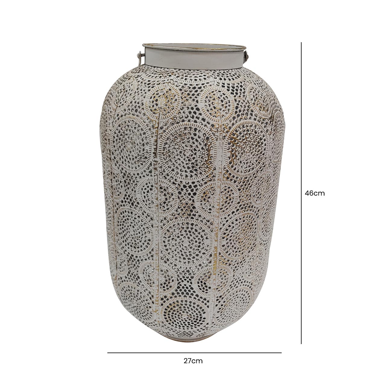 Elevate your décor with this 46cm white and gold reticulated metal lantern. The intricate reticulated design, combined with elegant white and gold tones, creates a stunning visual effect when lit. Perfect for floors, tabletops, or as a centerpiece, it brings a warm and inviting ambiance to any space. Ideal for both everyday décor and special occasions.