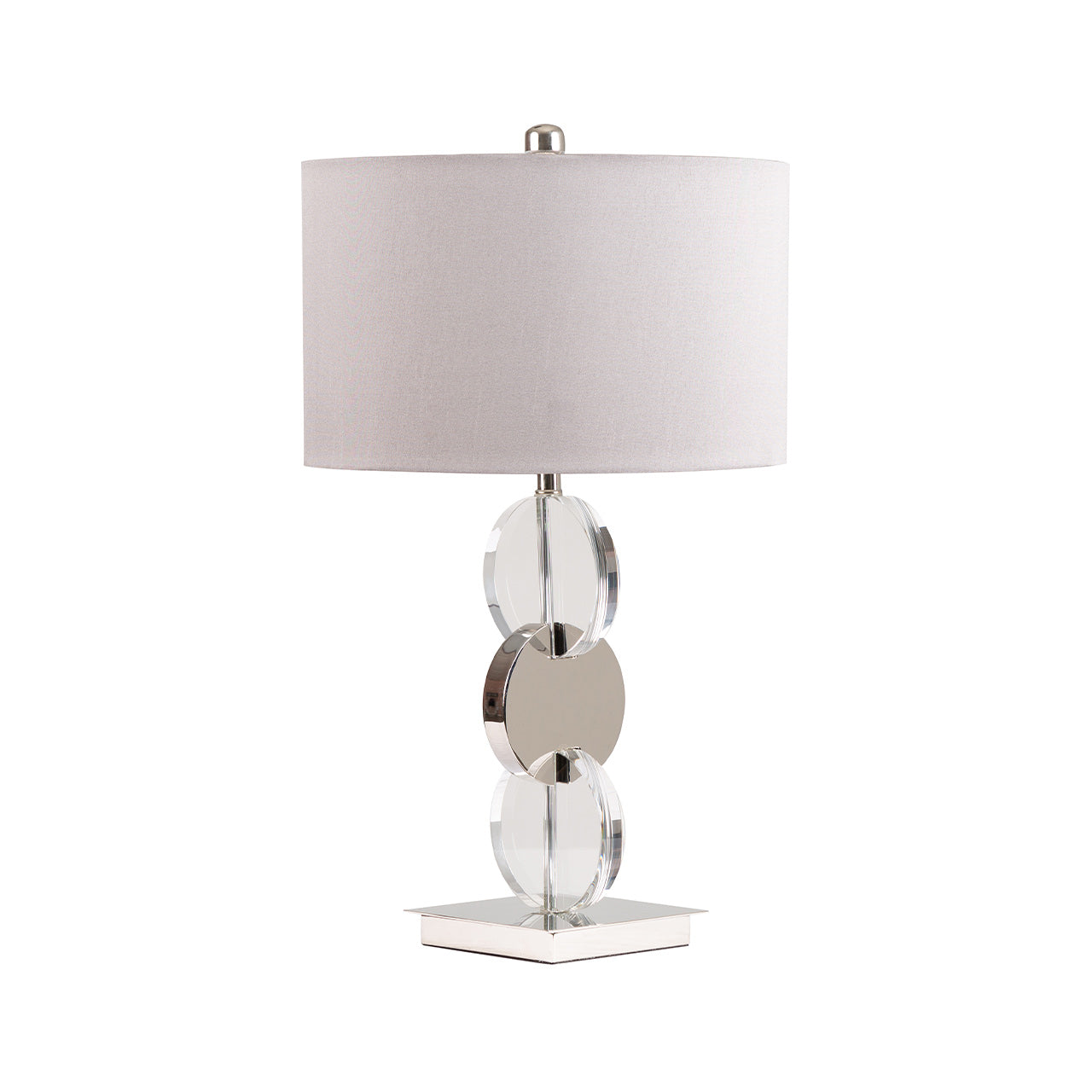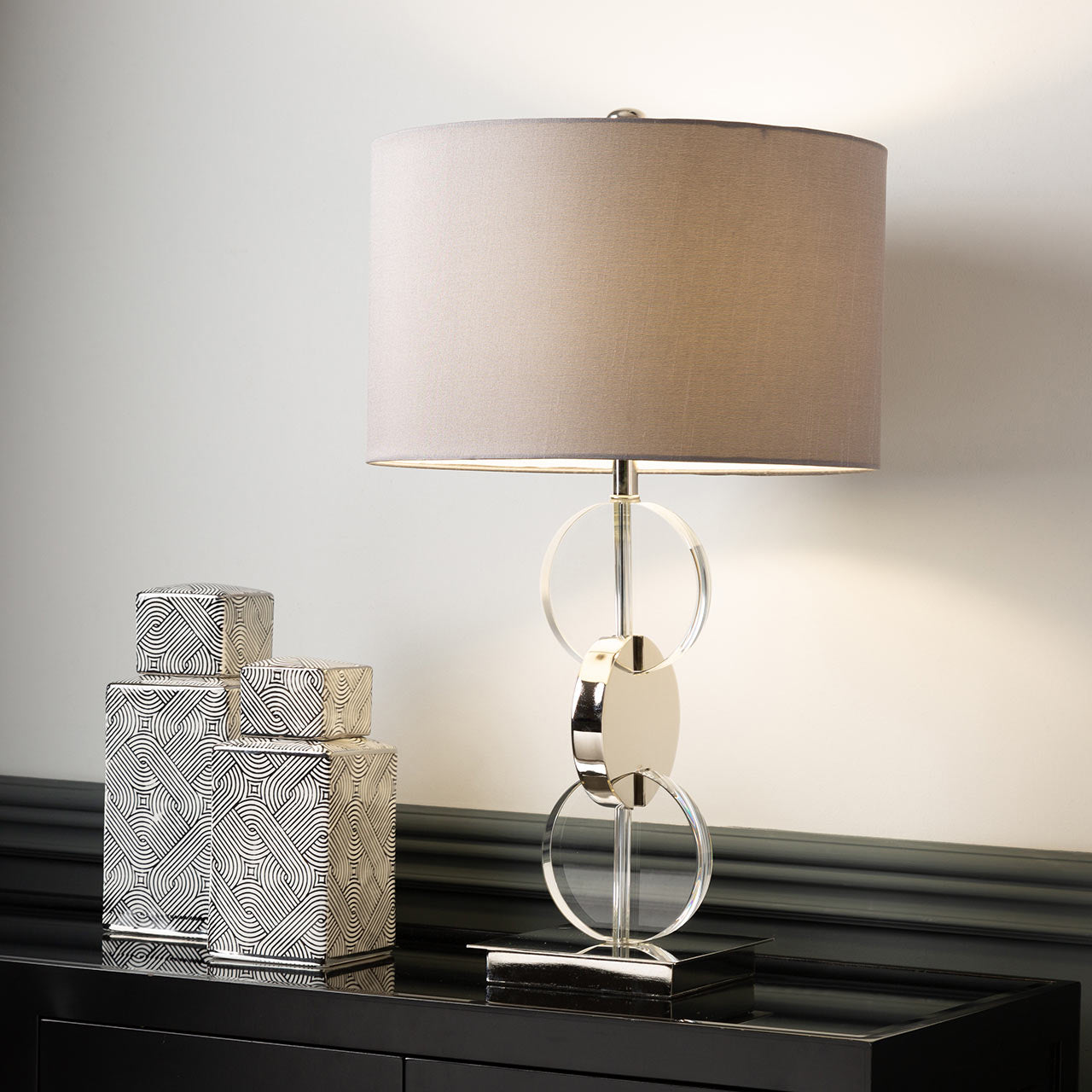 Add contemporary elegance to your interior with the 66cm Chrome Table Lamp featuring a dark grey faux silk shade. Designed as both a functional light source and a decorative statement, this lamp showcases a striking three-tiered circular base with chrome and crystal detailing. The refined dark grey shade softens the light, creating a warm and inviting glow that enhances living rooms, bedrooms, or office spaces. Its balanced height and sculptural form make it ideal for bedside tables, consoles, or buffet units.