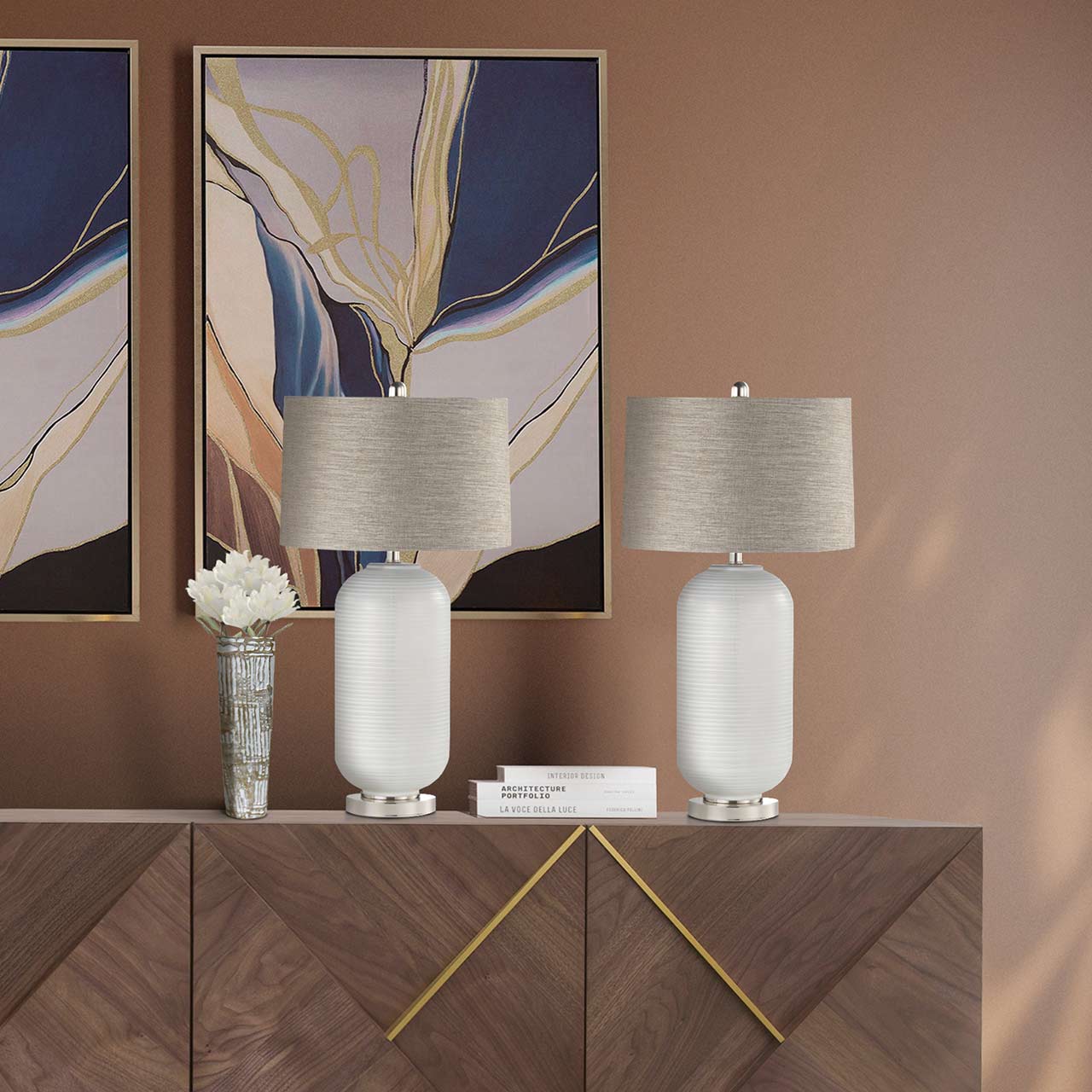 Bring refined elegance and warmth to your space with the 77.5cm Grey Stripe Glass Table Lamp with Brown Linen Shade. Designed with a beautifully striped glass base in subtle grey tones and finished with a rich brown linen shade, this table lamp creates a soft, ambient glow perfect for bedrooms, living rooms, or bedside tables. Its tall profile and balanced design make it both a practical lighting solution and a stylish décor statement.