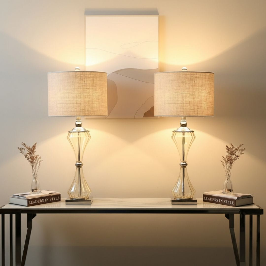 Bring timeless elegance to your interiors with this Set of 2 – 82cm Clear Glass Table Lamps with Cream Linen Shades. Designed with classic hourglass-shaped clear glass bases, each lamp adds a refined and airy feel to any room. The soft cream linen shades diffuse light beautifully, creating a warm and inviting ambiance ideal for bedrooms, living rooms, or reading corners. Their tall silhouettes make them striking decorative pieces, while the transparent glass design ensures they blend seamlessly with both modern and classic décor styles. Fully assembled and ready to use, these lamps are as practical as they are stylish.