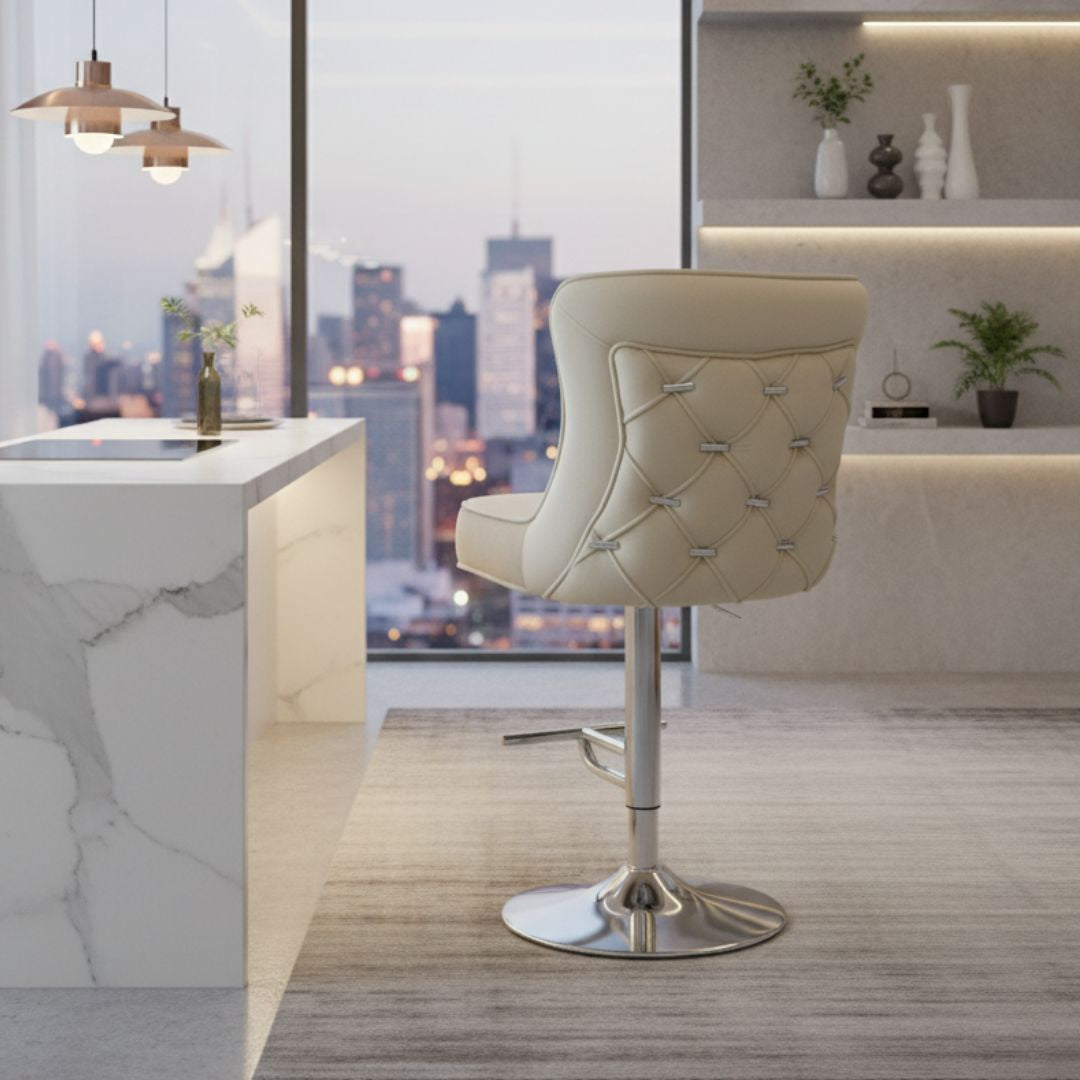 Elevate your home bar or kitchen island with this luxurious bar stool, expertly crafted to combine style and comfort. The stool features a plush taupe upholstered seat, offering a sophisticated neutral tone that complements any décor. Its sleek chrome base adds a touch of modern elegance, while the adjustable seating ensures the perfect height for your needs. Whether you're enjoying a casual breakfast or hosting a chic cocktail party, this bar stool offers an impeccable blend of luxury and practicality, making it a must-have for any contemporary space.