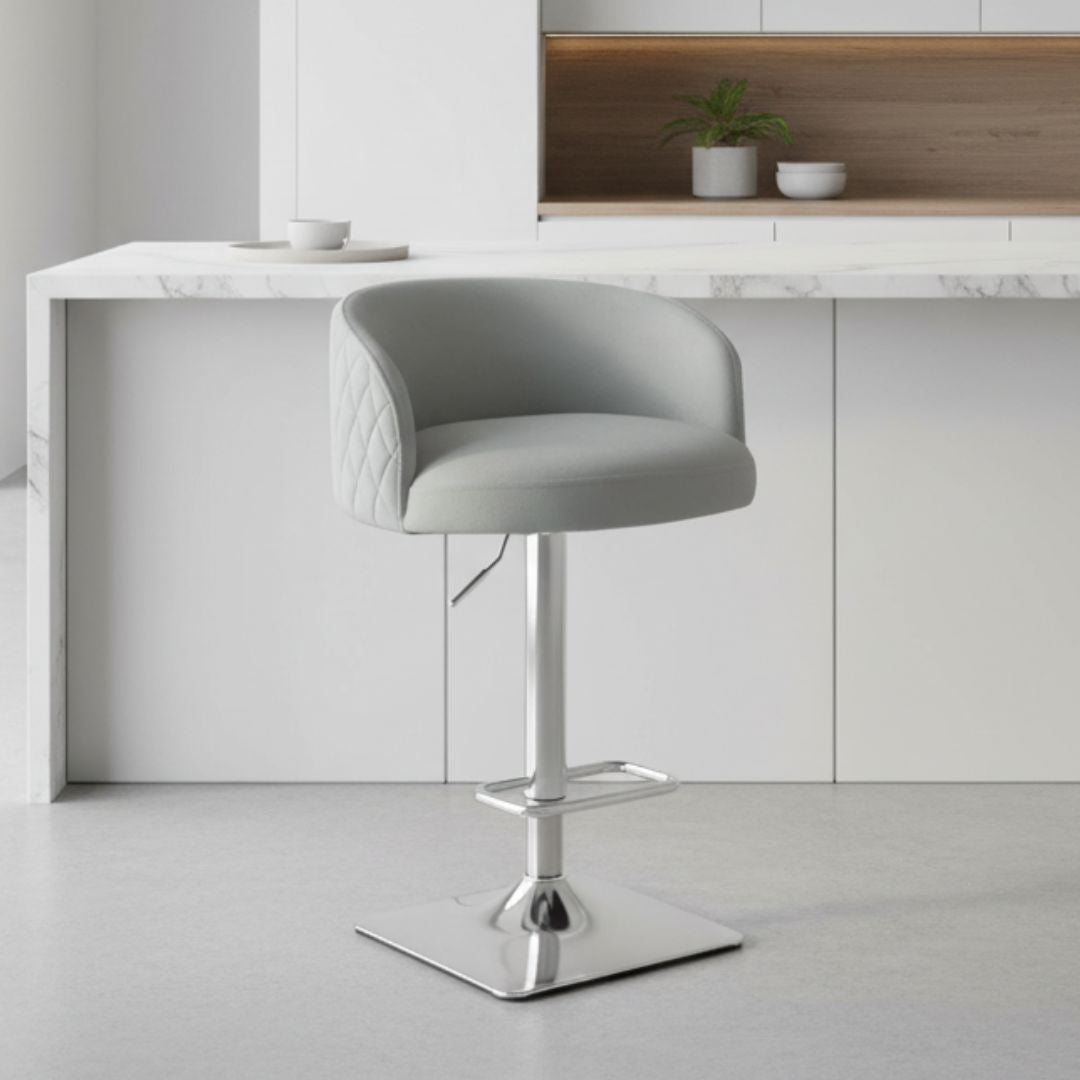 Introducing the pinnacle of sophistication and design, the Santos Premium Velvet Grey Bar Stool with Chrome Base. Enhance your bar or kitchen space with this exceptional seating option, crafted to offer both comfort and a dash of elegance to your environment.