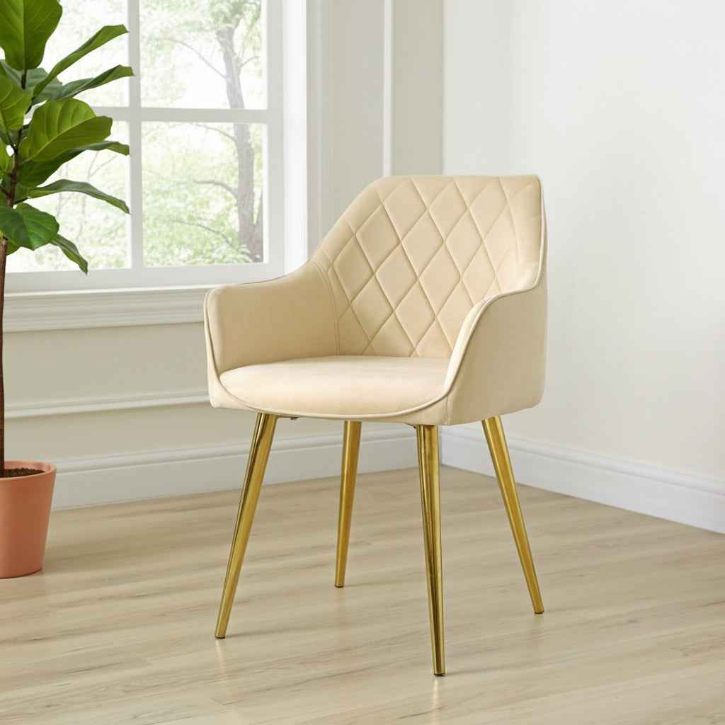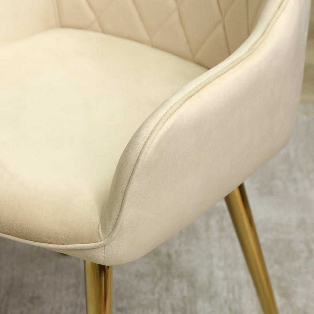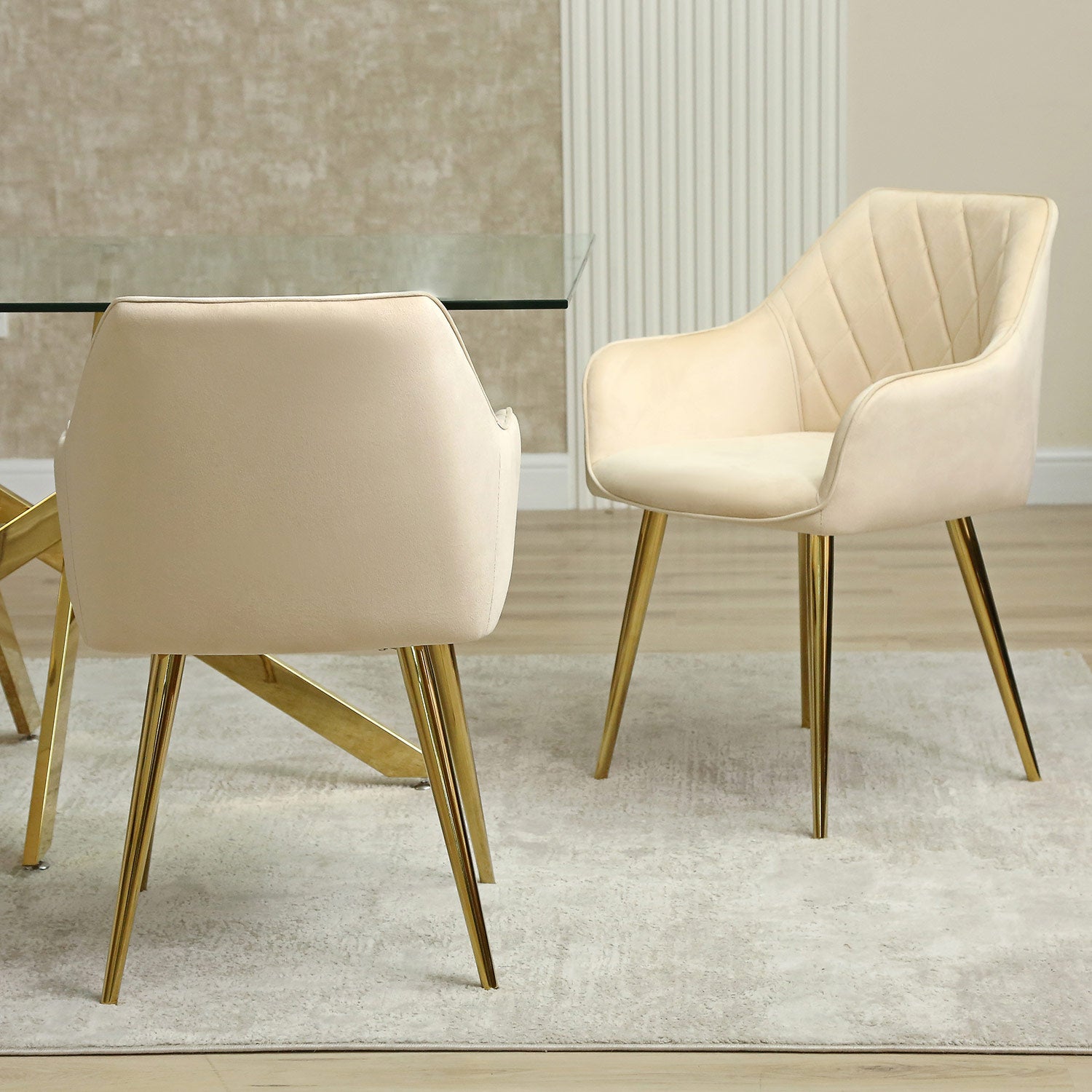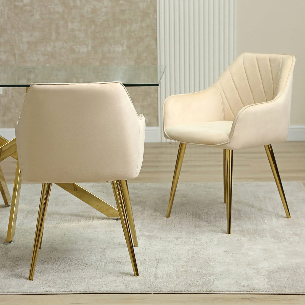 This set of chairs is designed for comfort with its wide seat, curved backrest, and comfortable armrests, making it perfect for long dinner parties or extended work sessions. The cream-colored upholstery adds a touch of modern elegance to any room, and its versatile design allows it to complement a variety of decor styles.