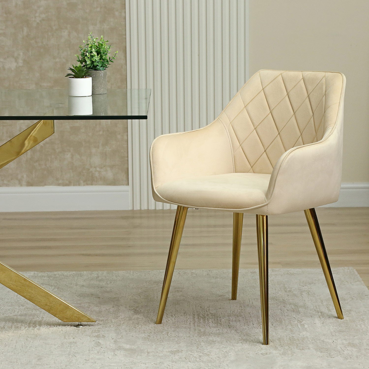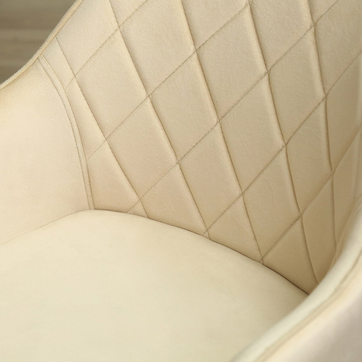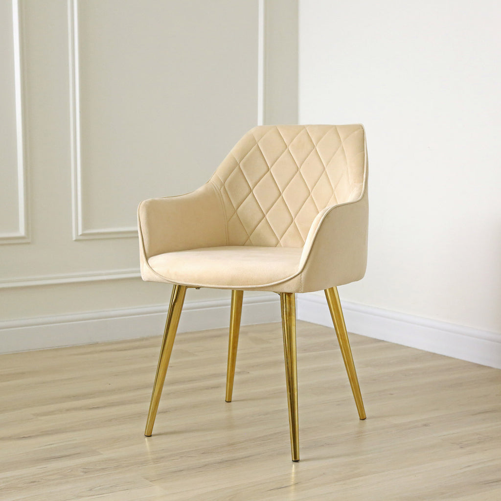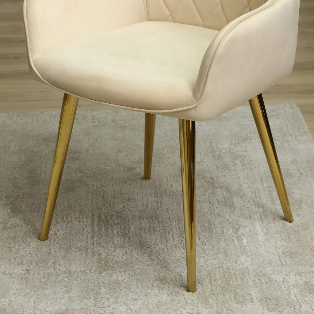 This set of chairs is designed for comfort with its wide seat, curved backrest, and comfortable armrests, making it perfect for long dinner parties or extended work sessions. The cream-colored upholstery adds a touch of modern elegance to any room, and its versatile design allows it to complement a variety of decor styles.