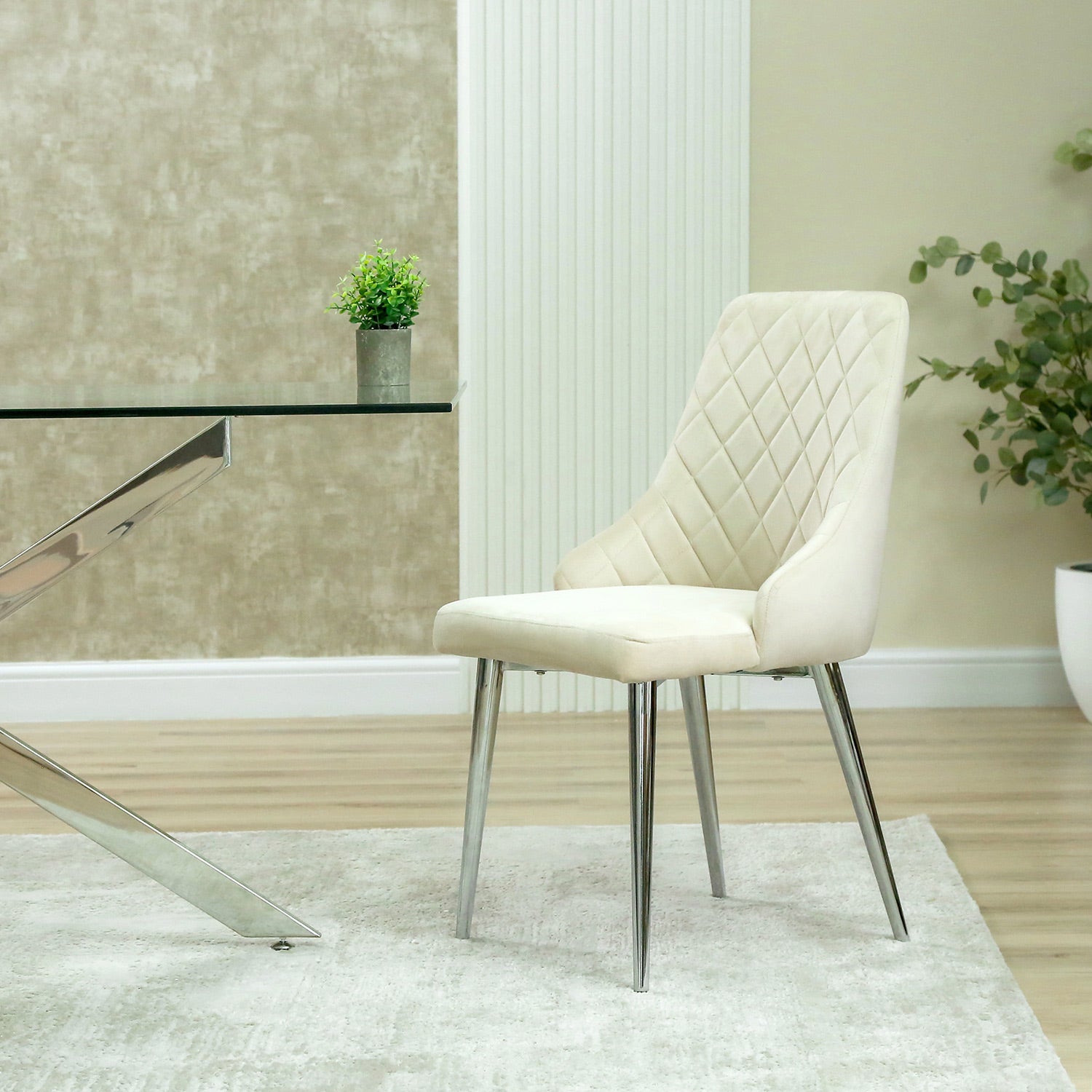 The chairs are made with high-quality materials, ensuring durability and long-lasting use. The seats are designed with comfort in mind, providing a comfortable seating experience for extended meals or gatherings. The Chrome-finished legs add an extra touch of glamour to the overall design, making them a great addition to any contemporary dining room decor. These chairs are also lightweight and easy to move, making them perfect for entertaining guests or rearranging your dining room layout.