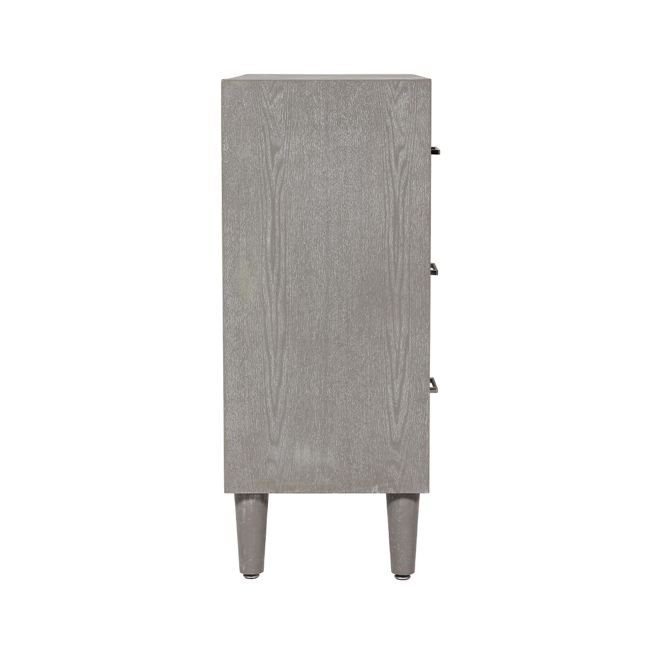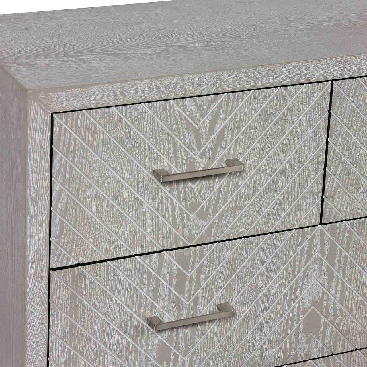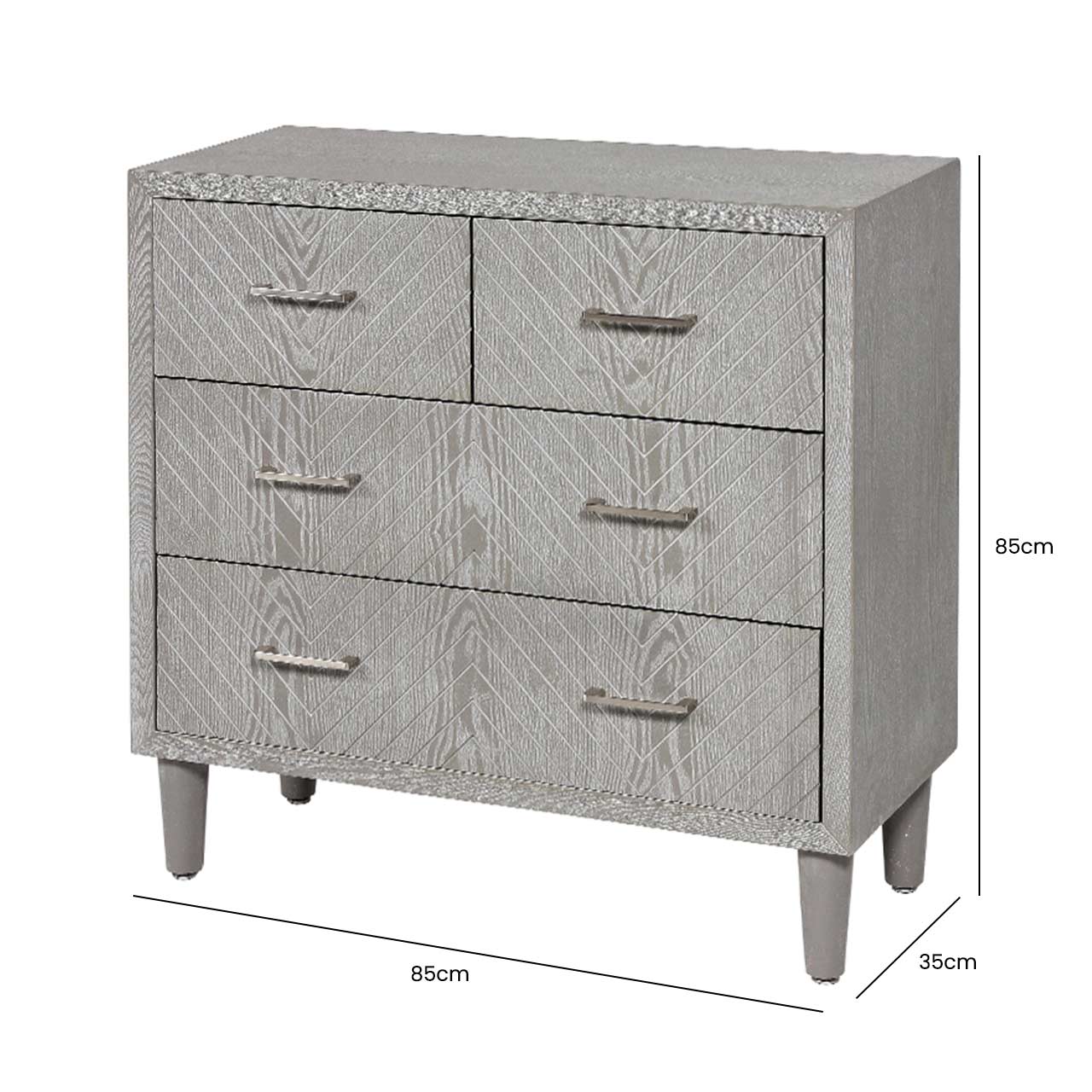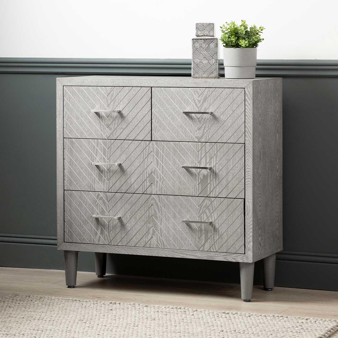 This four-drawer set is simple yet stylish addition to any bedroom. The muted grey-washed elm grain finish with chevron detailing adds a touch of visual interest to the piece, while the sleek satin steel bar handles on the drawer fronts provide a modern touch. The elegant turned legs give the set a classic look and feel, making it both tasteful and functional. With four spacious drawers, this set provides ample storage space for all your bedroom essentials.