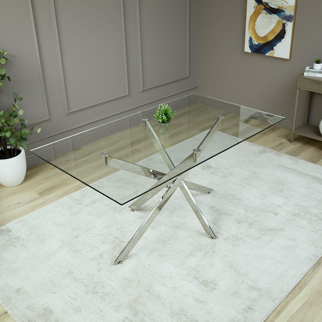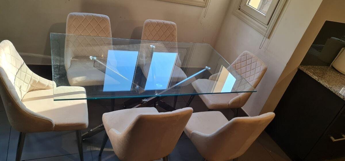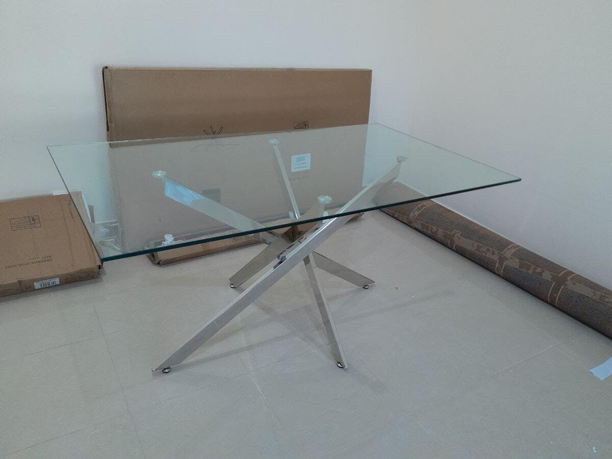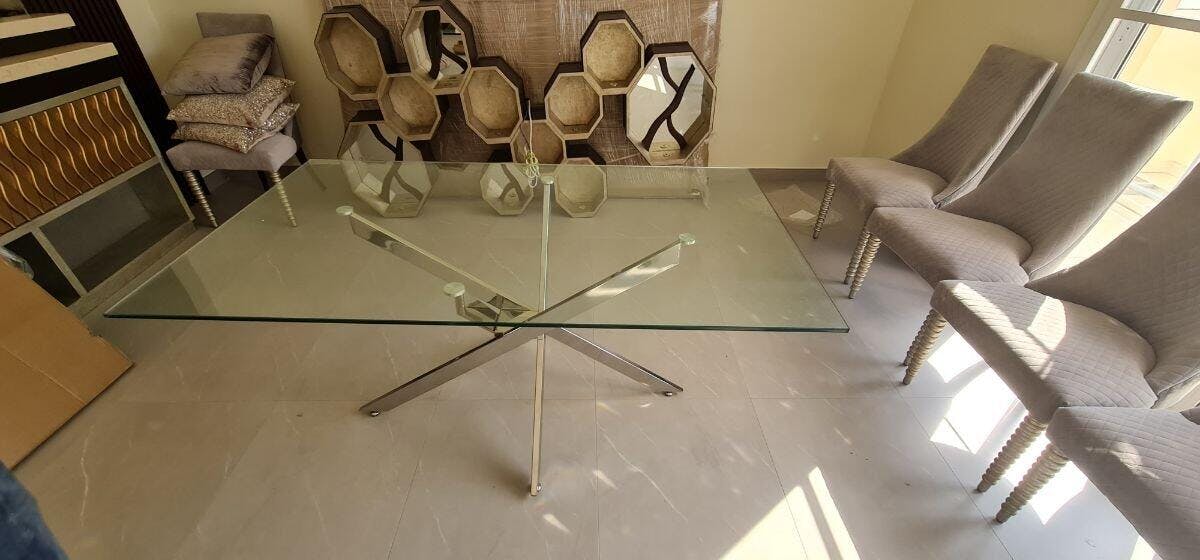 With this sleek and sophisticated large dining table, you can improve your eating experience. The wide tempered glass top and stainless steel legs with a swirl design give the table a contemporary and stylish appearance, and the floor protectors guarantee that your flooring won't be harmed. This table is a wonderful addition to any house and is ideal for large spaces. It can comfortably accommodate more than four people.