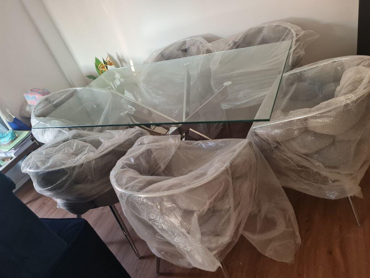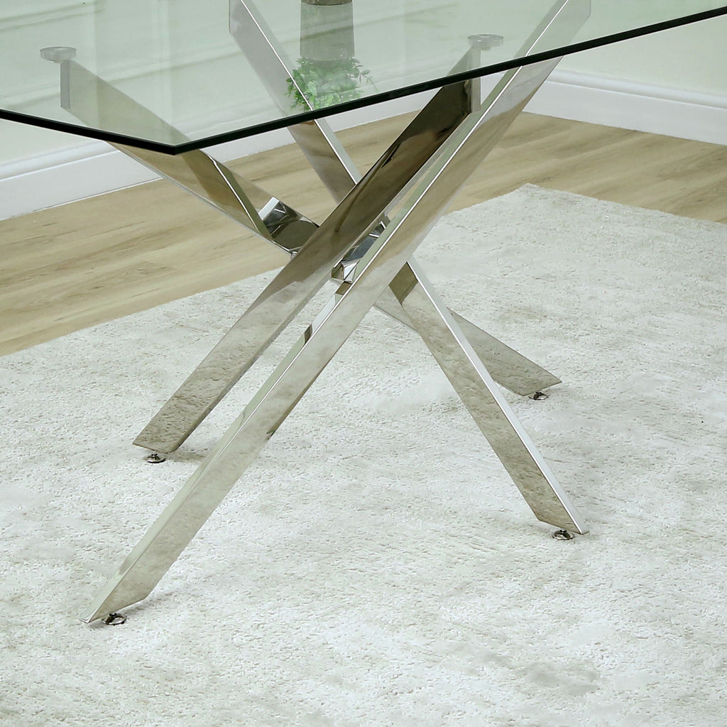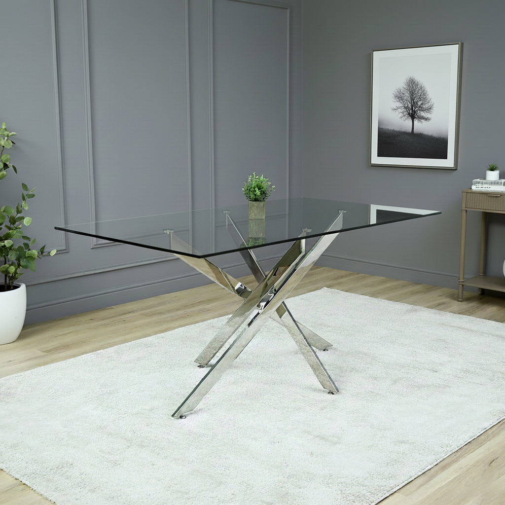 With this sleek and sophisticated large dining table, you can improve your eating experience. The wide tempered glass top and stainless steel legs with a swirl design give the table a contemporary and stylish appearance, and the floor protectors guarantee that your flooring won't be harmed. This table is a wonderful addition to any house and is ideal for large spaces. It can comfortably accommodate more than four people.