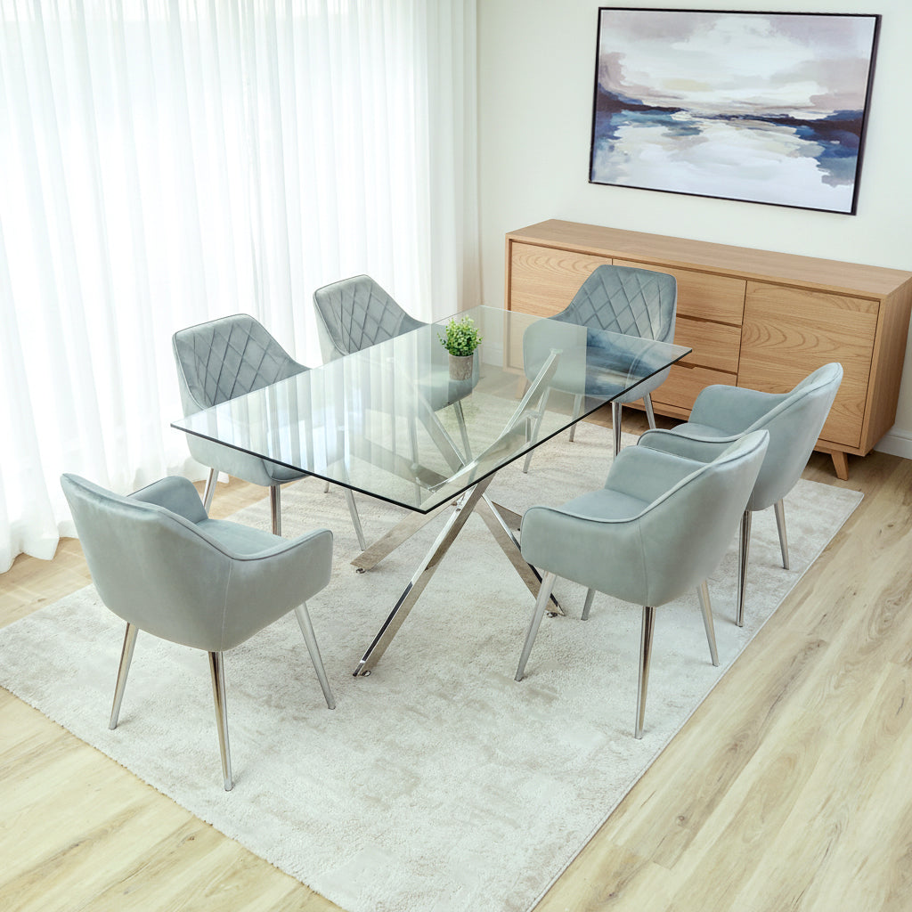 This shining blend of clear glass and chrome steel Davos Chrome Large dining table with the velvet Leon Grey dining chairs that have a comfortable arm rests, wide seat, and the curved back of this grey chair ensures to sit back relax, unwind and guaranteed to provide you with a modern and fashion-forward look in your kitchen or dining room. Whether you utilize this fine table for formal dining arrangements or just for your everyday gathering, this piece will provide a fresh and glamorous feel to your home.