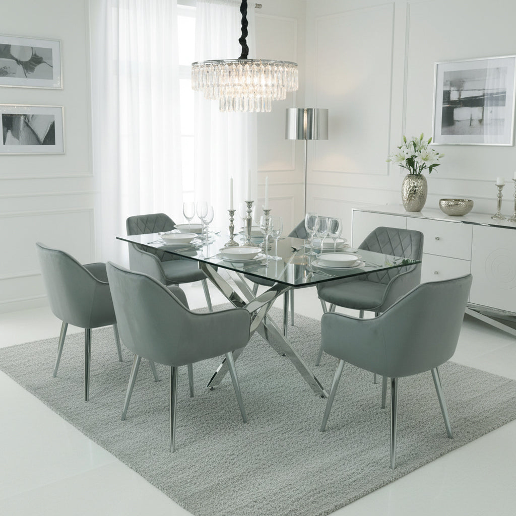 Davos Chrome Large Dining Table With 6 Leon Grey Dining Chairs