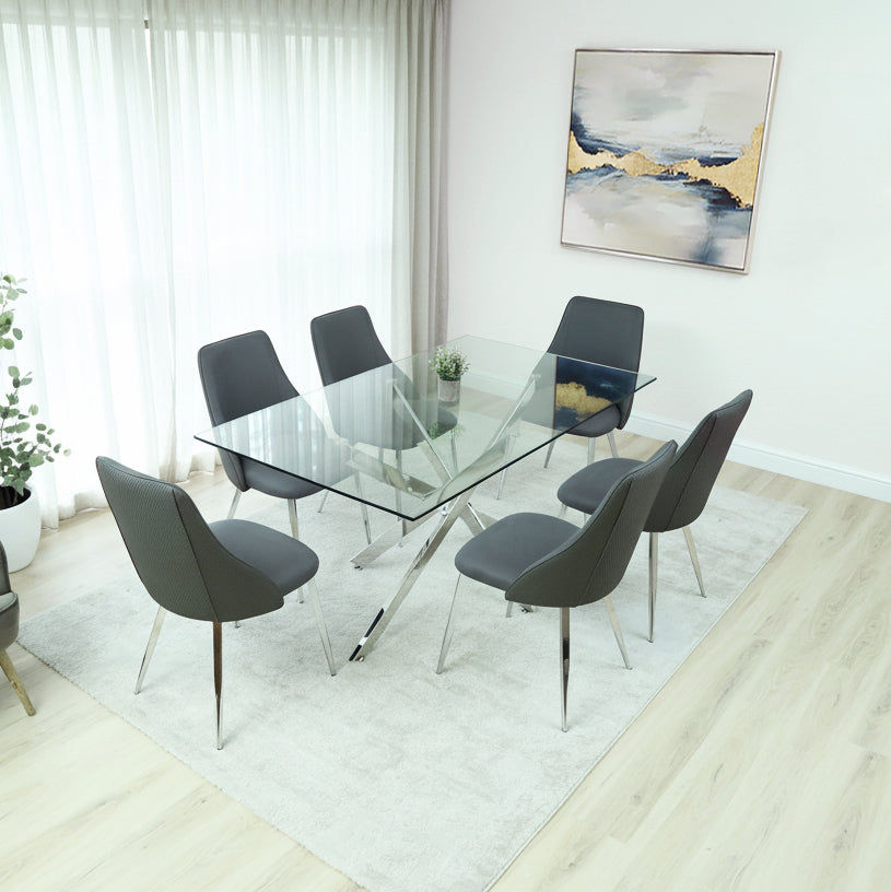 The Davos Chrome Large Dining Table Set, featuring six Sienna Grey Chairs, exemplifies modern elegance and functionality. This exquisite set includes a spacious dining table crafted with a sleek chrome finish, providing a contemporary and sophisticated appeal. The table's large surface offers ample room for dining and socializing, making it an ideal centerpiece for family gatherings or entertaining guests. Complementing the table are six Sienna Grey Chairs, each boasting a plush, comfortable seat and a graceful silhouette. These chairs are upholstered in a high-quality grey fabric, adding a touch of luxury and warmth to the dining experience. The combination of the chrome table and grey chairs creates a harmonious blend of style and comfort, perfect for any modern dining room.