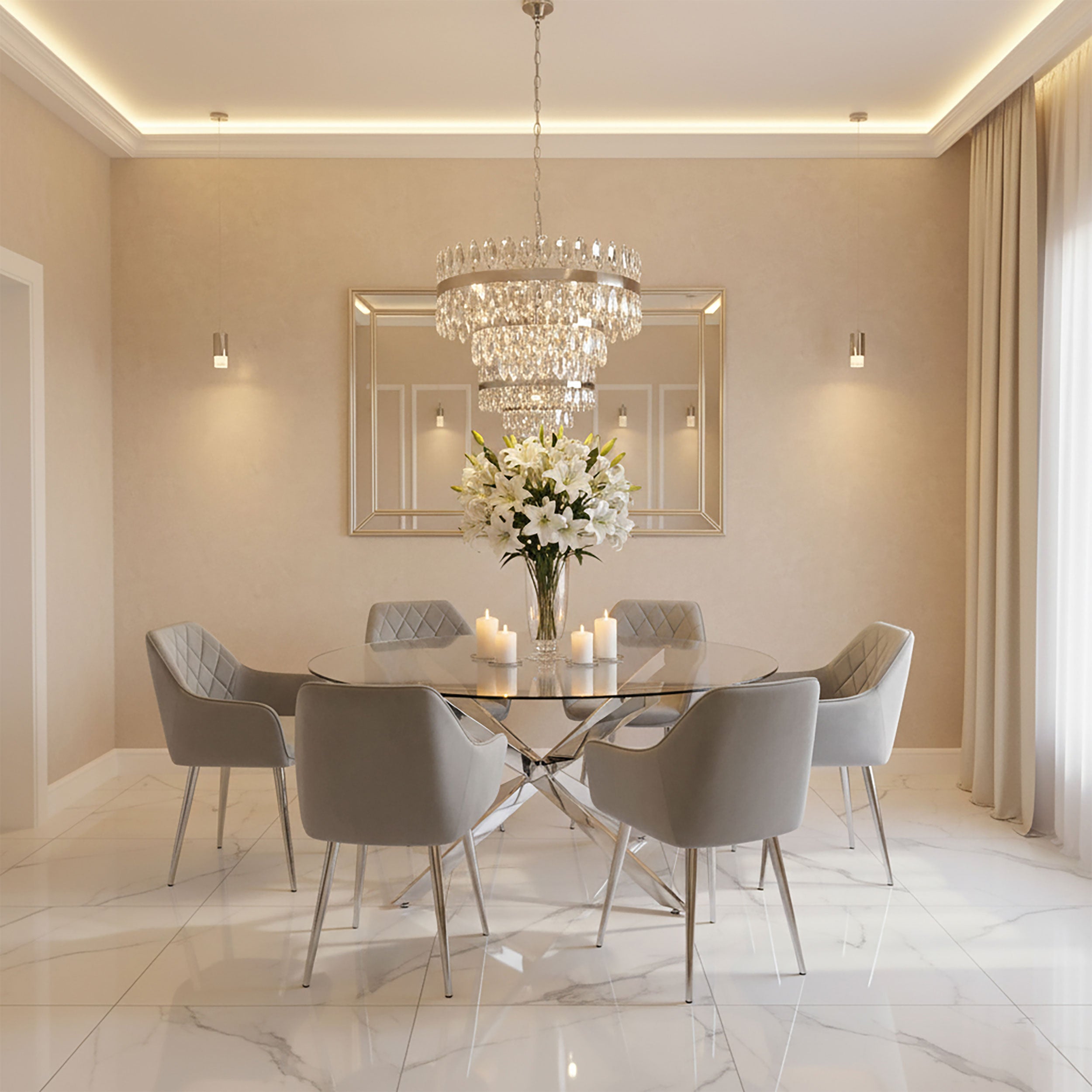 Introducing the Davos Chrome Large Round Dining Table Set of 6 with Leon Grey Dining Chairs – a perfect blend of contemporary style and functional design to elevate your dining space. Crafted with meticulous attention to detail, this dining set promises to make every mealtime a luxurious experience. With the Davos Chrome Large Round Dining Table Set, you'll not only dine in style but also enjoy the comfort and durability that come with high-quality materials and craftsmanship. Whether you're hosting a formal dinner party or enjoying a casual family meal, this set will make your dining experience memorable and enjoyable. Upgrade your dining area with this stunning combination of modern aesthetics and practical functionality today!