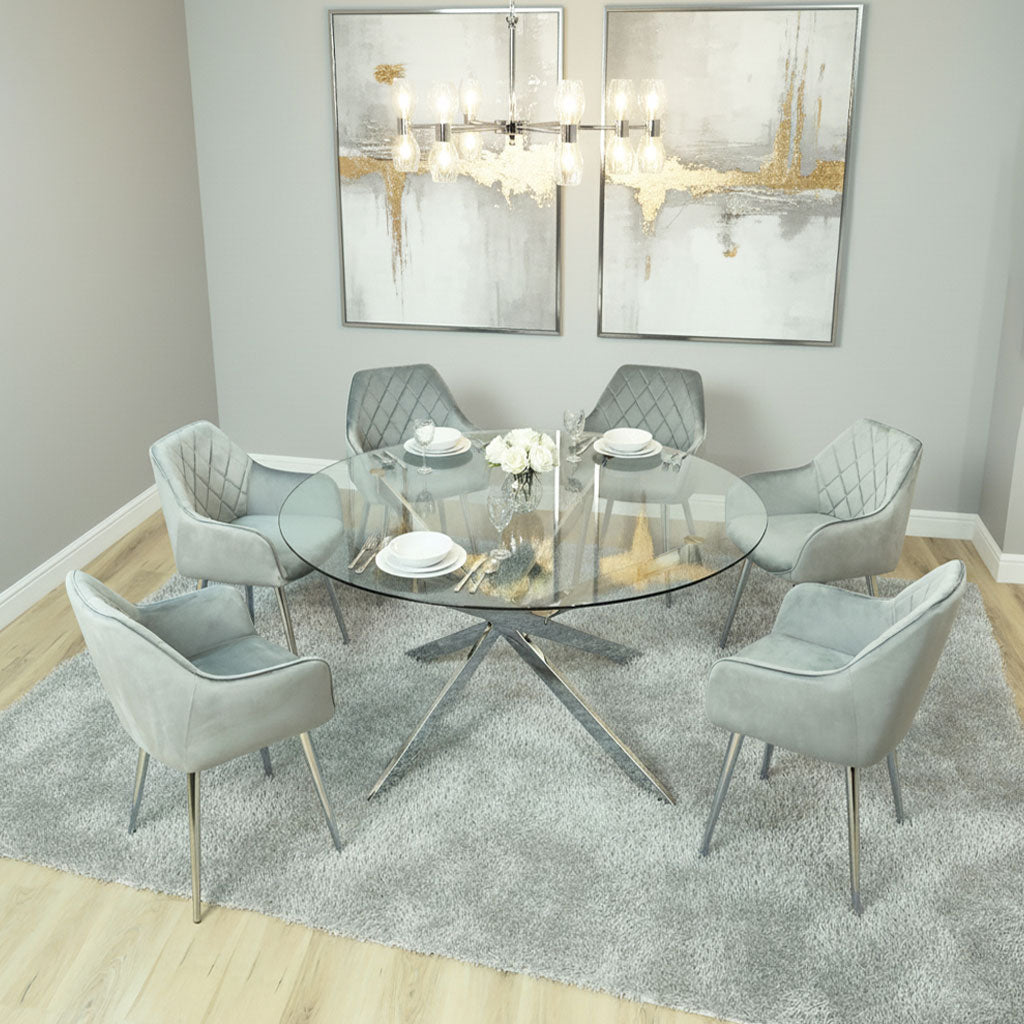 Davos Chrome Large Round Dining Table Set of 6 with Leon Grey Dining Chairs