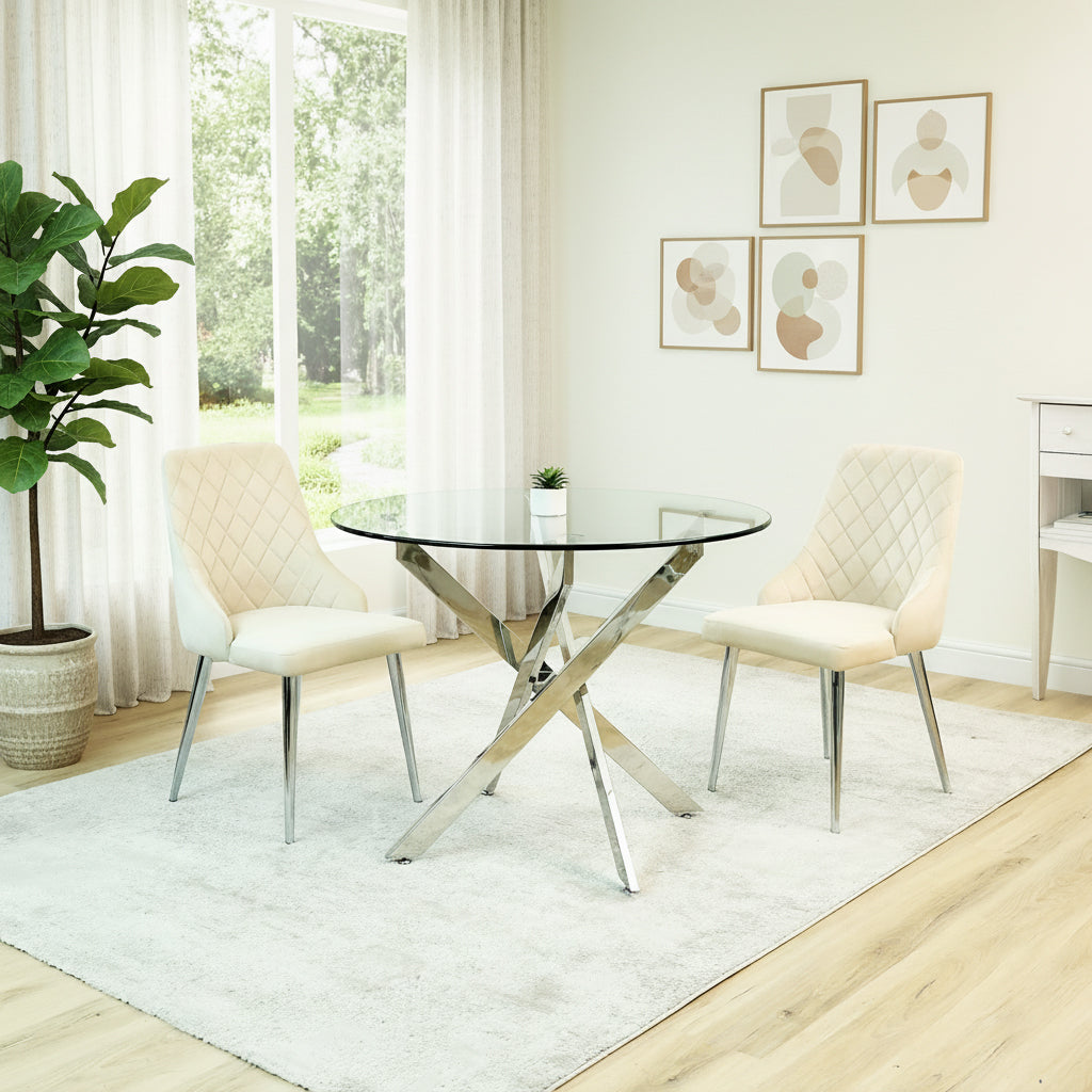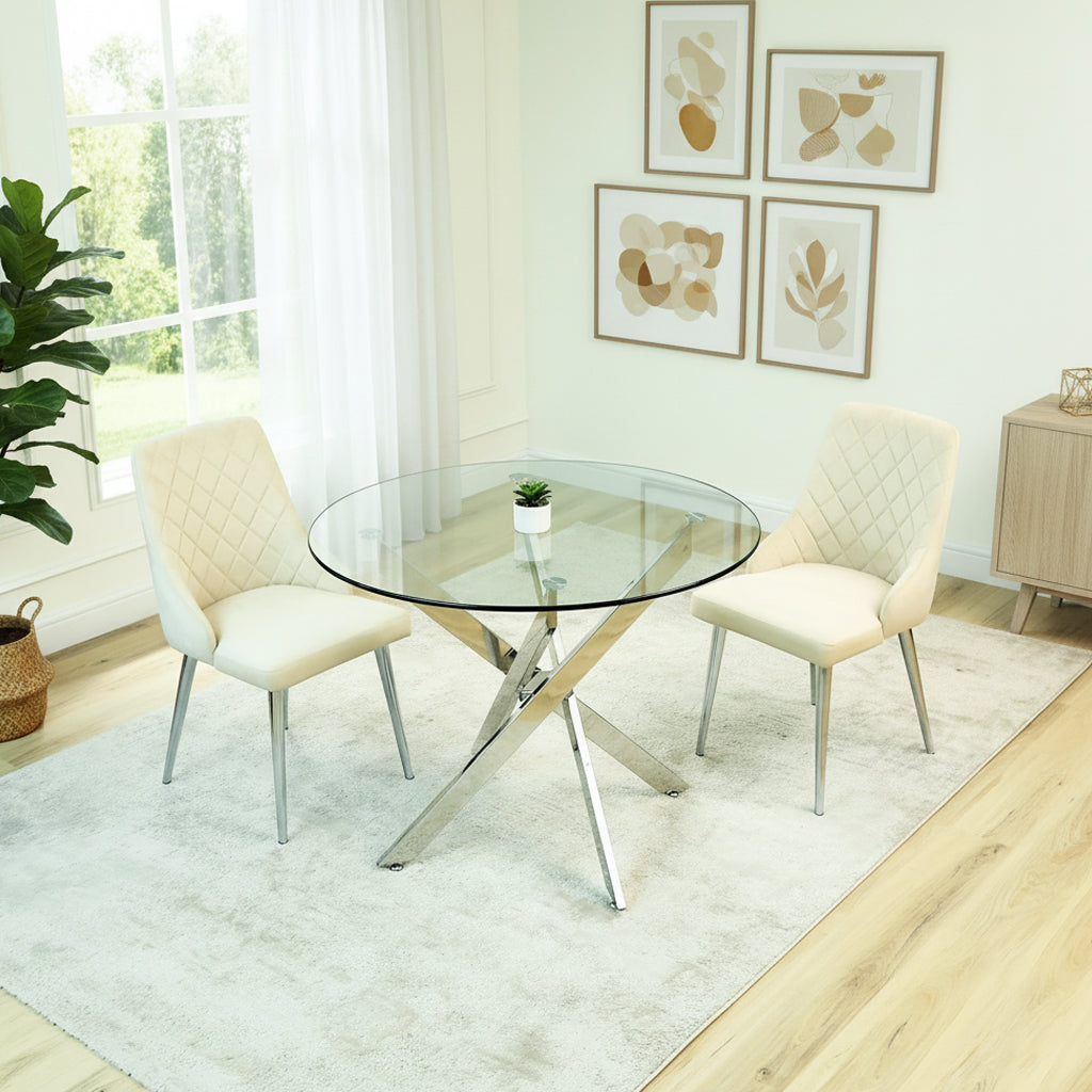 This shining blend of clear glass and chrome steel Davos Chrome Round dining table with the velvet Milan Cream dining chair that have a soft touch of velvet dark cream fabric, ensuring total support and comfort when seated, it is extremely durable as well as stylish and guaranteed to provide you with a modern and fashion-forward look in your kitchen or dining room. Whether you utilize this fine table for formal dining arrangements or just for your everyday gathering, this piece will provide a fresh and glamorous feel to your home.