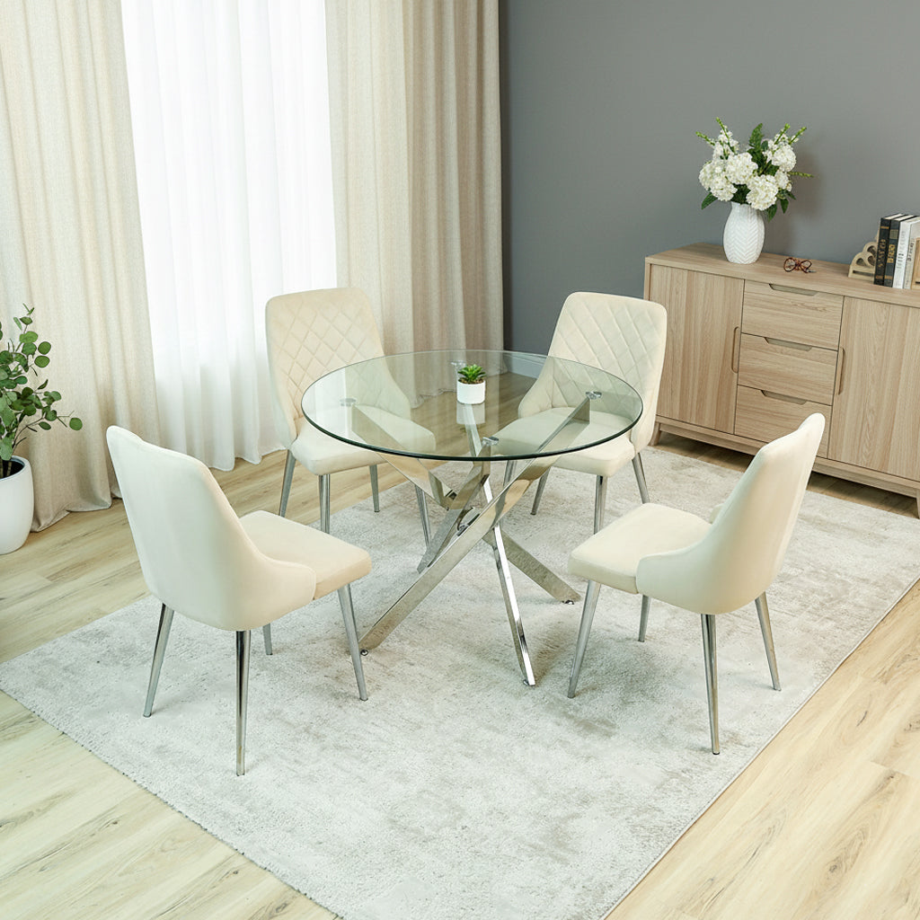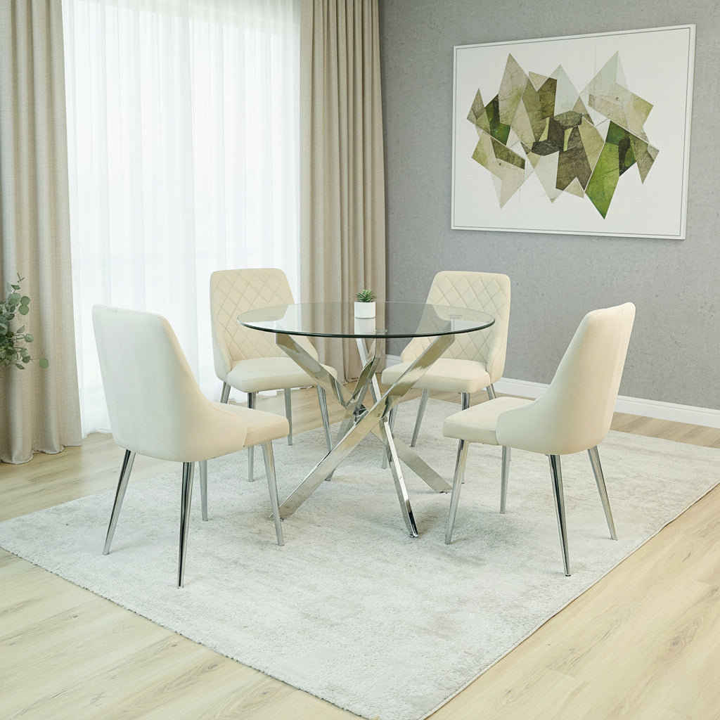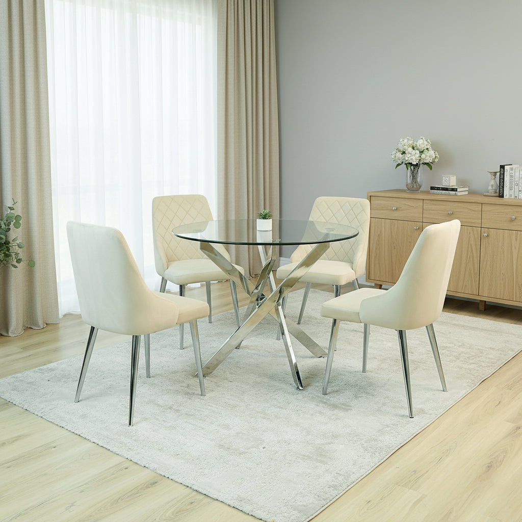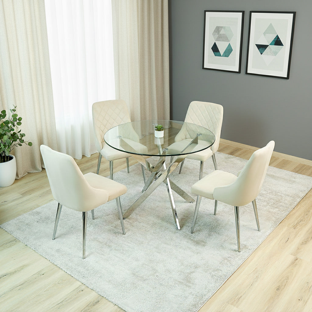 This shining blend of clear glass and chrome steel Davos Chrome Round dining table with the velvet Milan Cream dining chair that a soft touch of velvet dark cream fabric, ensuring total support and comfort when seated, it is extremely durable as well as stylish and guaranteed to provide you with a modern and fashion-forward look in your kitchen or dining room. Whether you utilize this fine table for formal dining arrangements or just for your everyday gathering, this piece will provide a fresh and glamorous feel to your home.