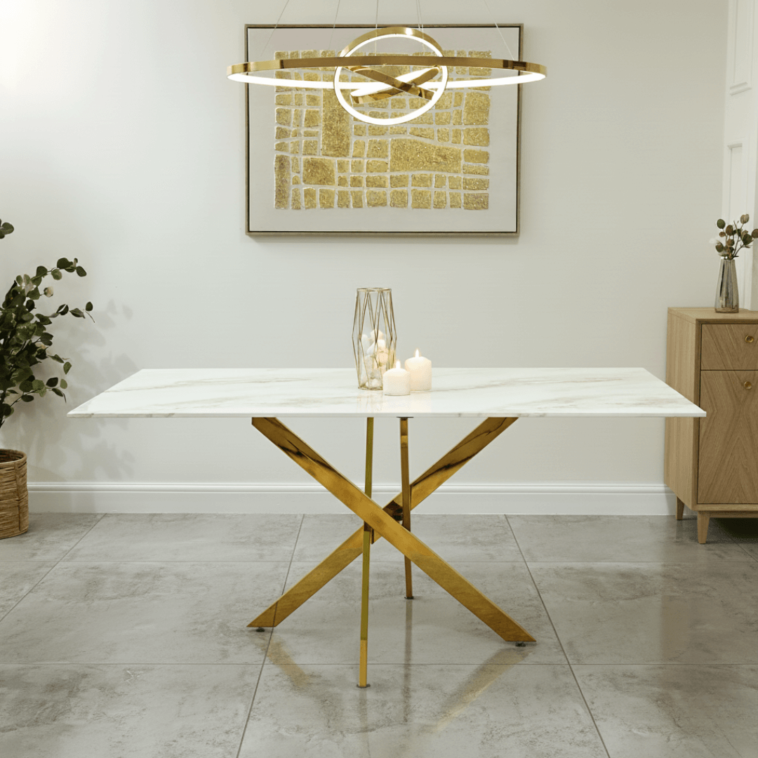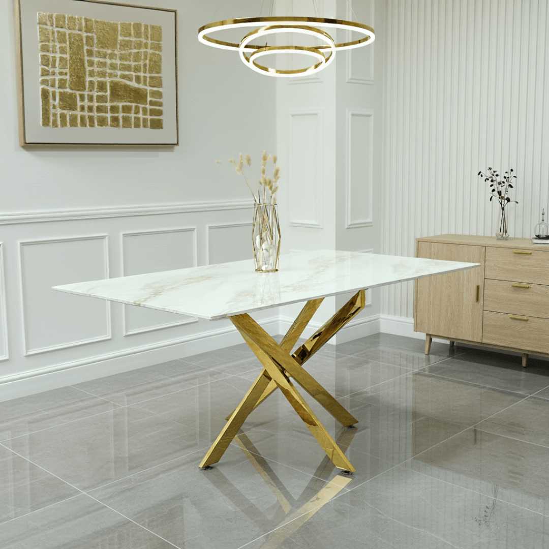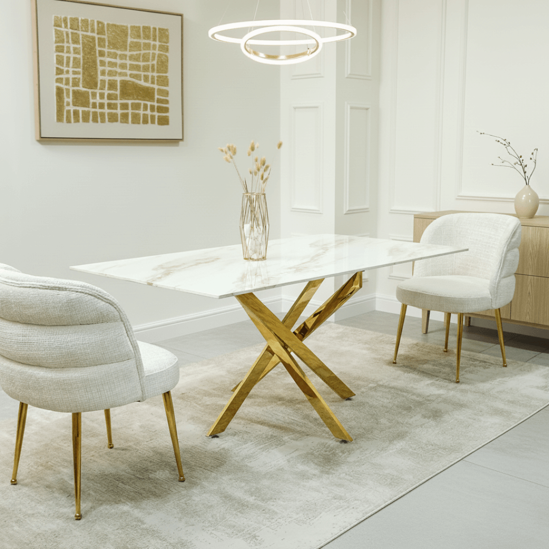 The Davos Cream Marble Craft Dining Table brings timeless luxury to your dining space. Featuring a sophisticated cream marble-effect tempered glass top and sturdy stainless gold steel legs, this spacious 6-seater table blends style with durability, making it the perfect centerpiece for modern and classic interiors alike.