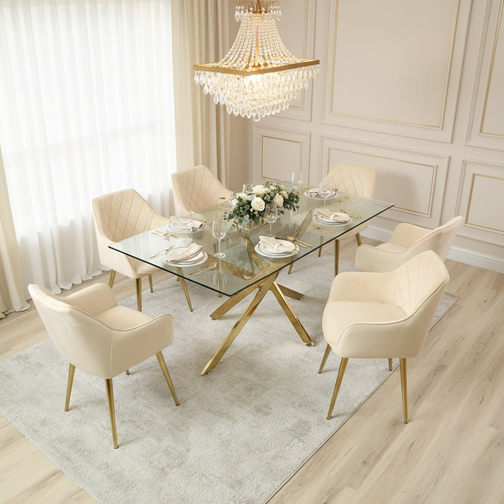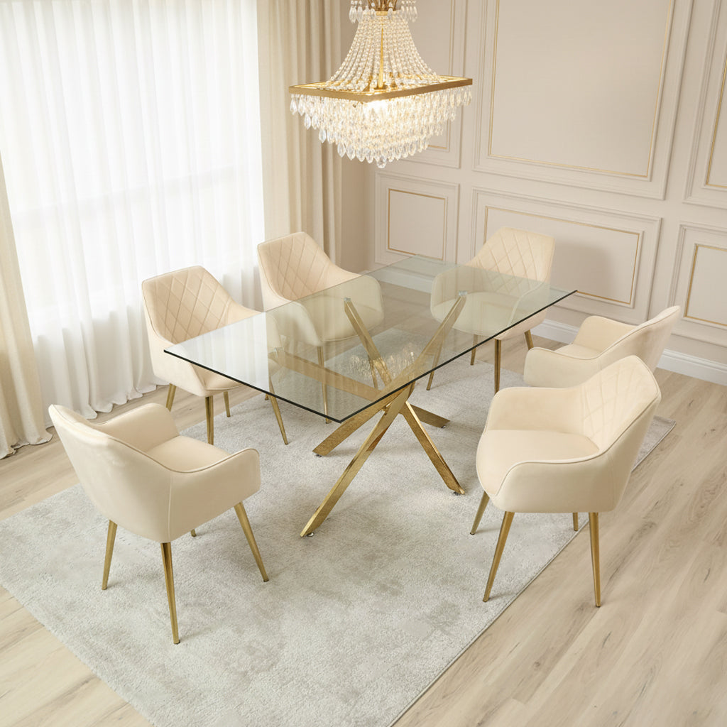 Davos Gold Large Dining Table with 6 Leon Cream Dining Chairs