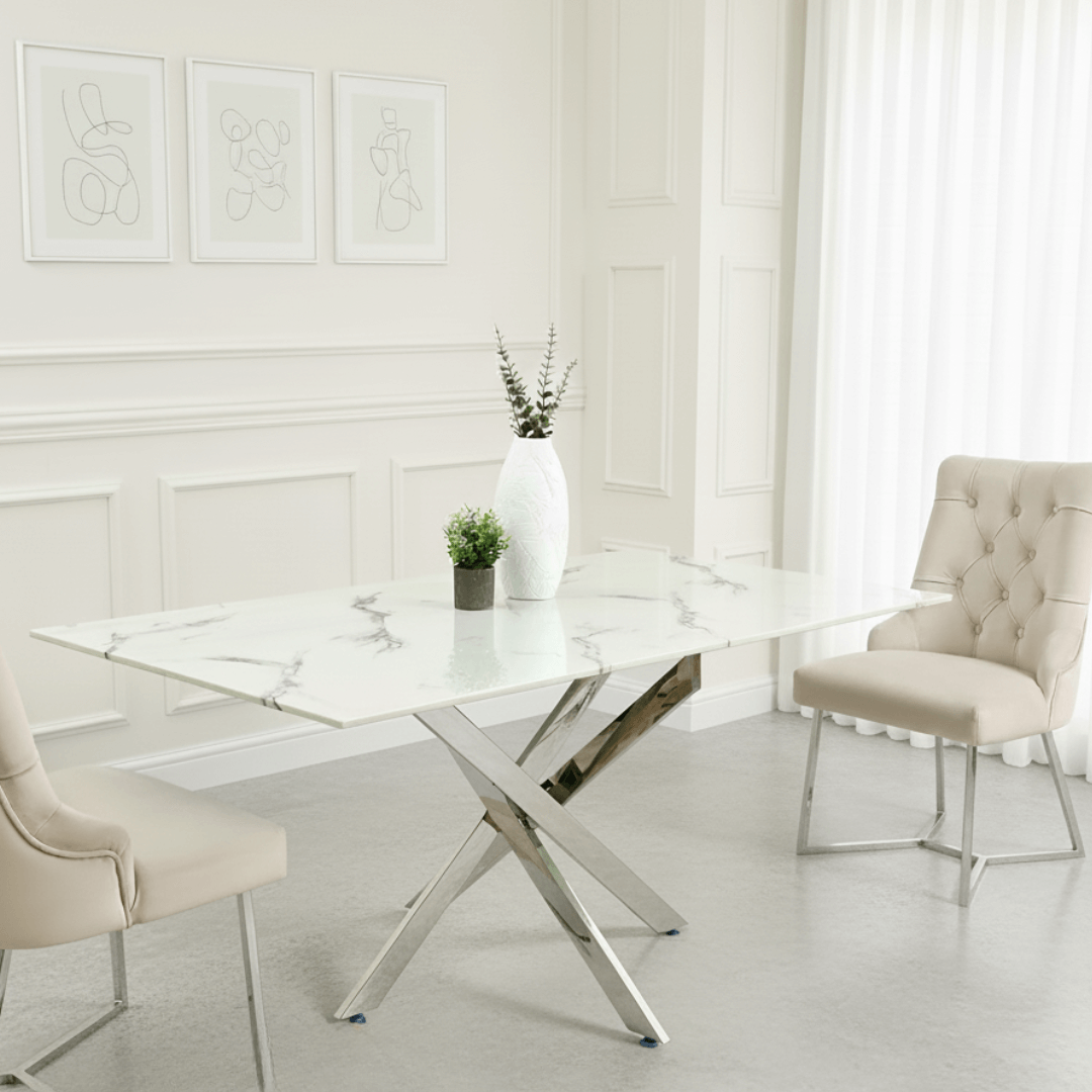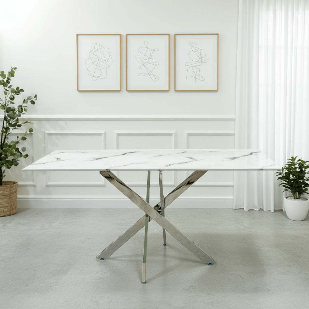 Elevate your dining space with the Davos Grey Marble Craft Dining Table. Featuring a stunning grey marble-effect tempered glass top and a sturdy chrome stainless steel base, this table seamlessly blends luxury with durability. Designed to seat six guests comfortably, it is an ideal centerpiece for both contemporary and classic interiors.