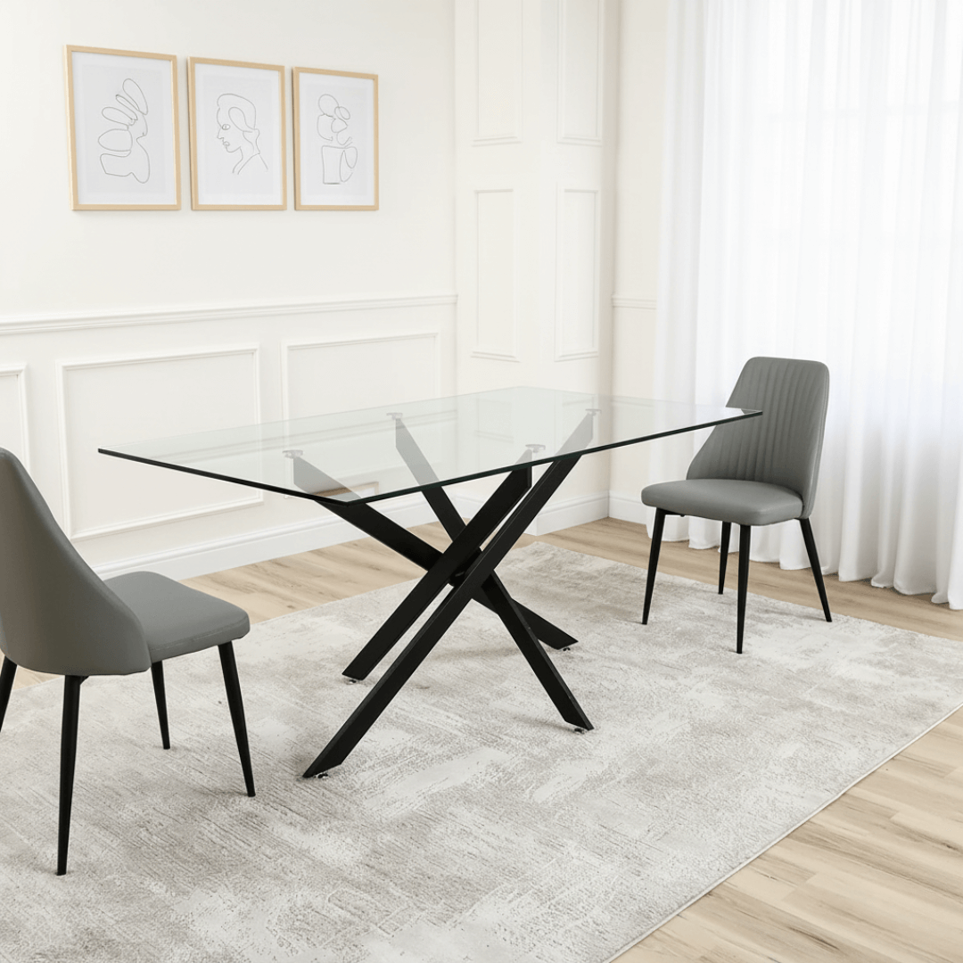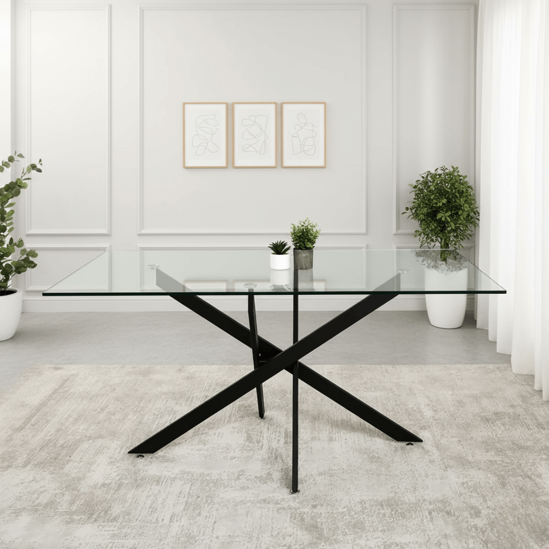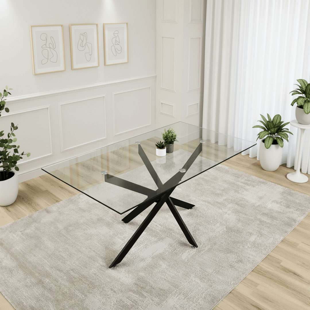 The table is crafted from high-quality materials, including a sturdy rectangular glass top and a crisscross black finish polished stainless steel base, which provide both durability and style. One of the best things about this dining table is that it has additional seating, making it perfect for hosting large gatherings or events. You can easily seat multiple guests around the table without having to worry about space constraints or sacrificing comfort.