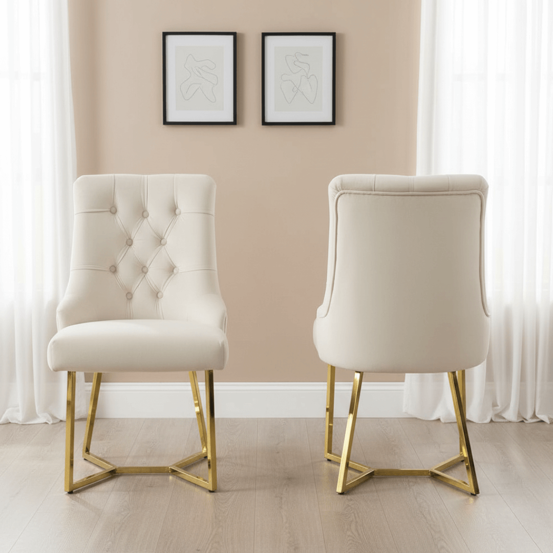 Elevate the sophistication of any space with our elegant Rinerra cream velvet dining chair. Designed to infuse a touch of luxury into your home or office, this chair is a seamless blend of comfort and style. From its plush cream velvet seat to the glittering gold metal legs, every detail has been meticulously crafted to offer a premium seating experience.