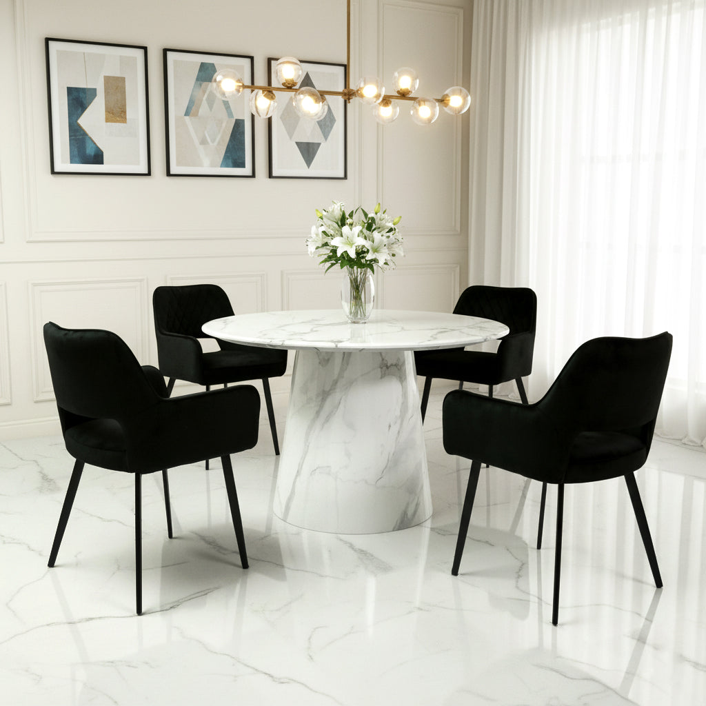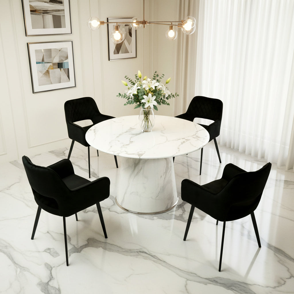 The marble-like surface brings a touch of luxury, with a timeless aesthetic that enhances any dining room décor.