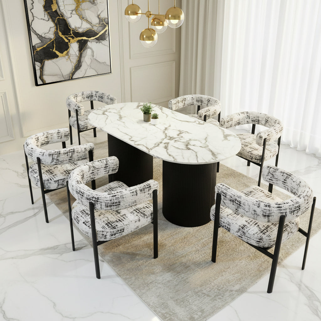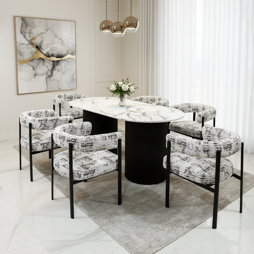 Step into a world of refined elegance with the Avellino Large Black Dining Table Set, paired with Six Kahlea Black & White. Thoughtfully curated to elevate smaller dining spaces, this 6-seater ensemble blends bold design with timeless sophistication.The table showcases a dramatic Off White & Black Ash Marble top, delivering both visual impact and lasting durability. Complementing it, the Kahlea Chairs feature soft fabric seats and backrests in a striking Black & White contrast, offering the perfect balance of comfort and modern style. This set is more than just dining furniture – it's a centrepiece designed to transform everyday dining into a luxurious, contemporary experience.