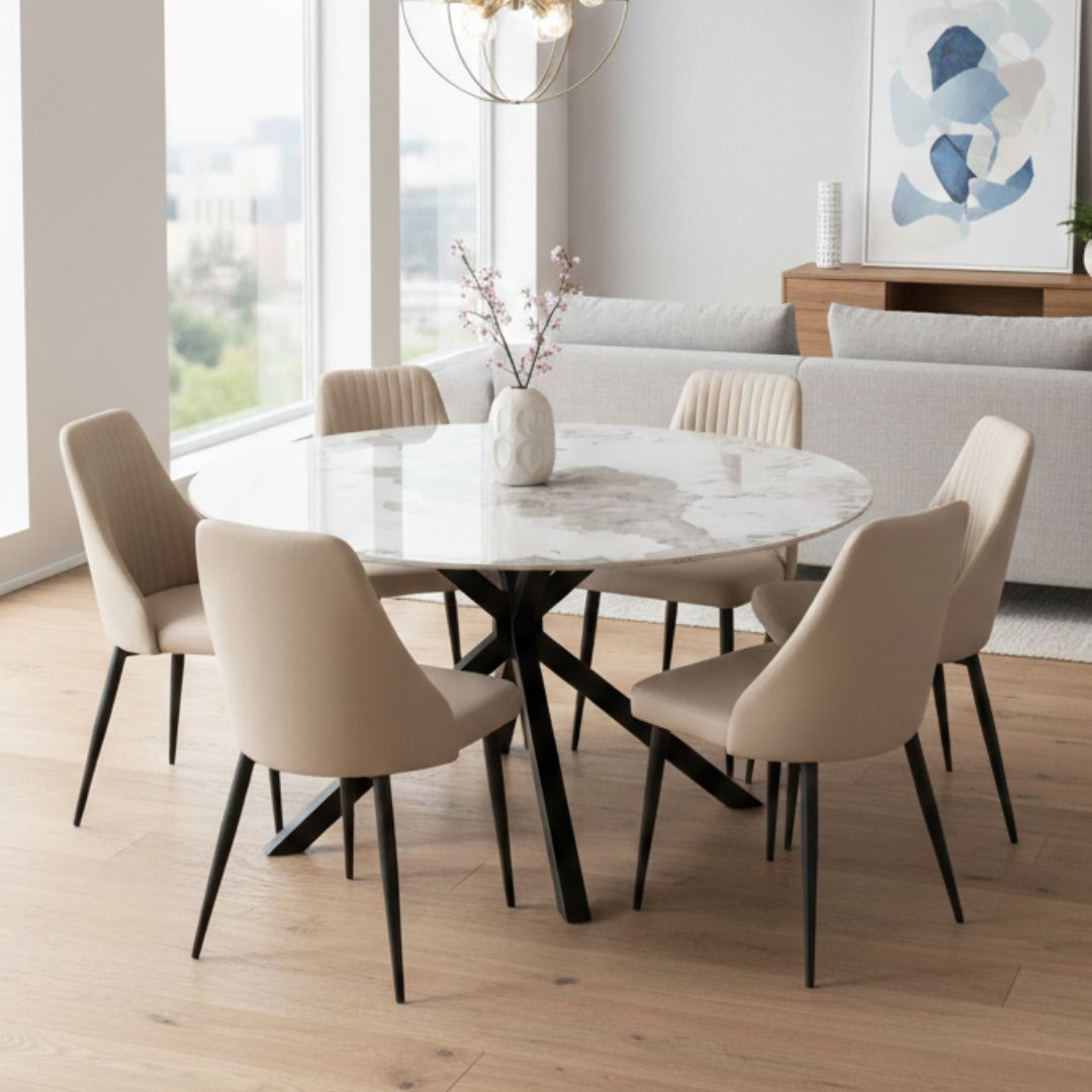 The table features an elegant round cream marble top, providing a luxurious touch and a durable surface for your dining needs. The chair is supported by robust legs with a Black Sandy Powder Coating finish, offering both stability and a modern touch. The chair features sumptuous Taupe PU upholstery that exudes elegance while being easy to maintain. The chair's ergonomic backrest provides optimal support, ensuring comfort during long meals. Product Highlights