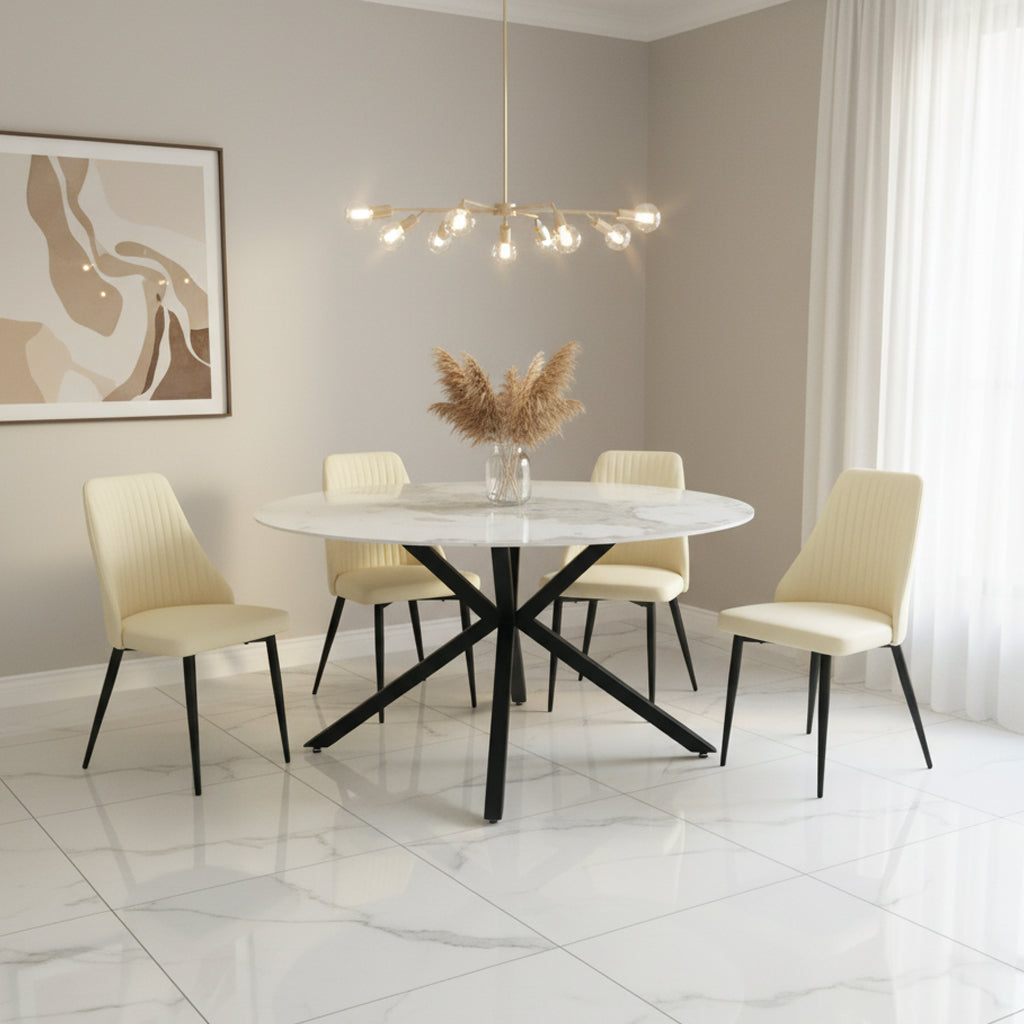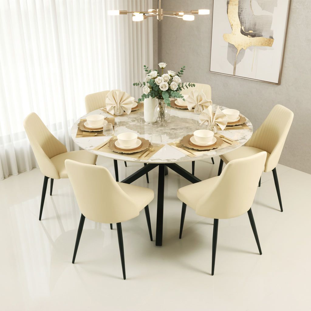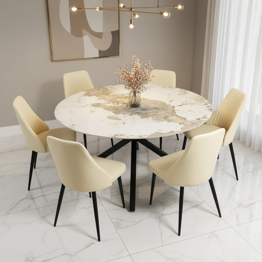 The table features an elegant round cream marble top, providing a luxurious touch and a durable surface for your dining needs.