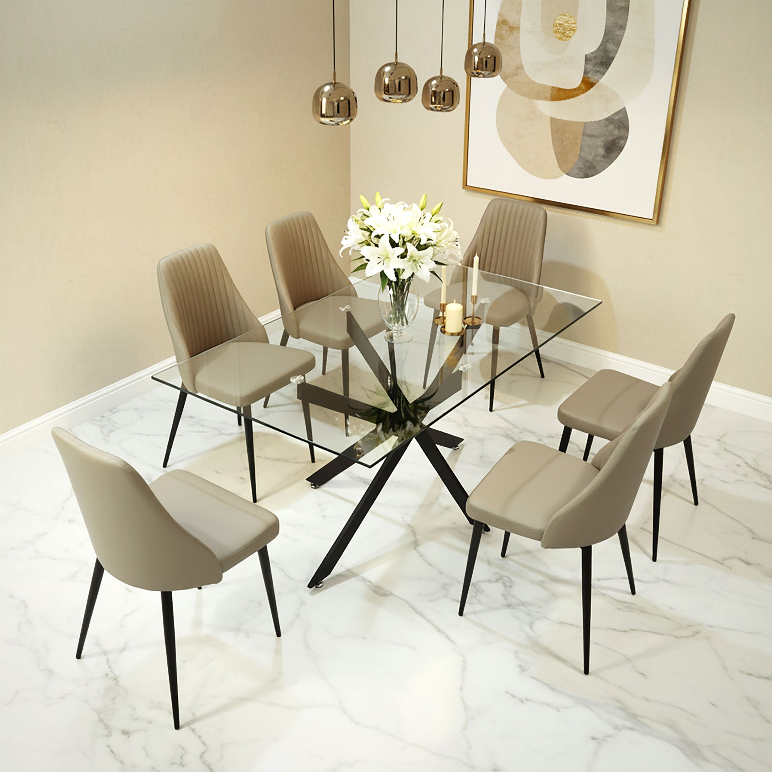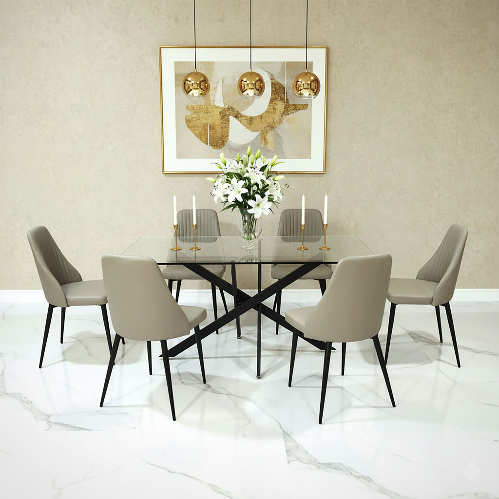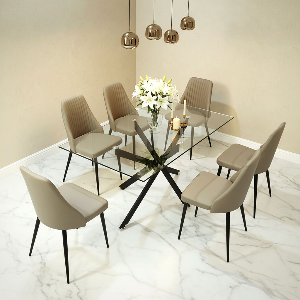 Unveil a realm of elegance and contemporary sophistication in your dining space with the Davos Large Black Dining Table Set, accompanied by Six Misano Taupe Chairs. This meticulously curated dining ensemble is designed to infuse luxury, durability, and a touch of modern aesthetics into your dining experience, ensuring every meal feels like a special occasion.This magnificent dining set perfectly balances luxe appeal with practical features, ensuring that it remains a centerpiece in your dining area, captivating admiration for its design and craftsmanship.
