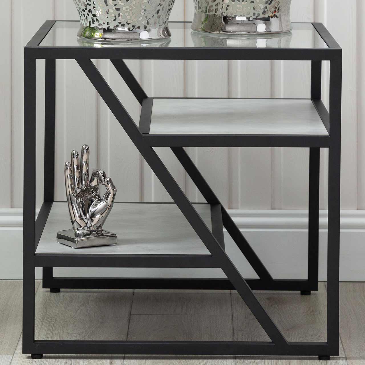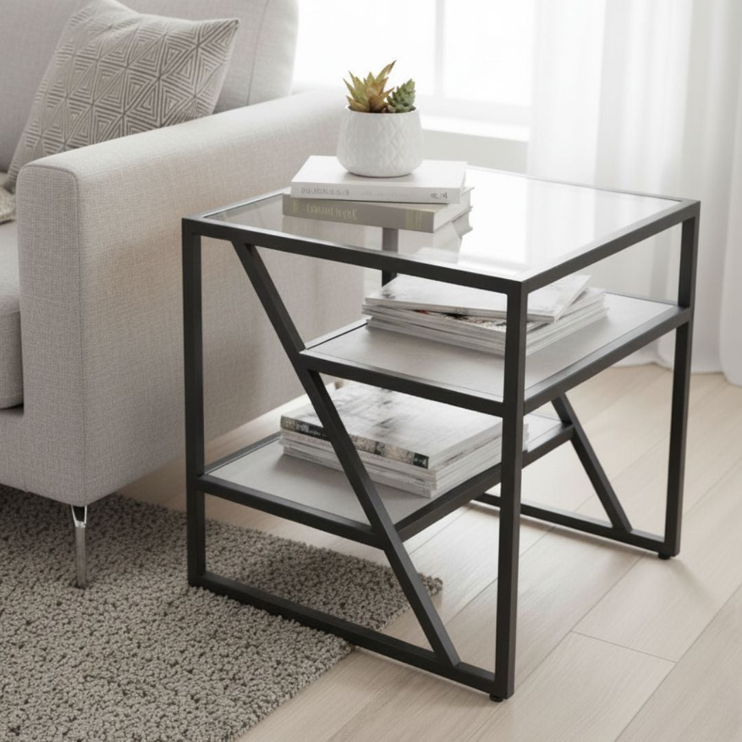 The Ibarra Black and Grey End Table - KD combines sleek design with practical functionality, featuring a sturdy black frame and a smooth grey finish. Compact and stylish, it’s ideal for placing beside a sofa, chair, or bed to hold a lamp, books, or decorative accents. Its modern appeal makes it a versatile addition to any room.