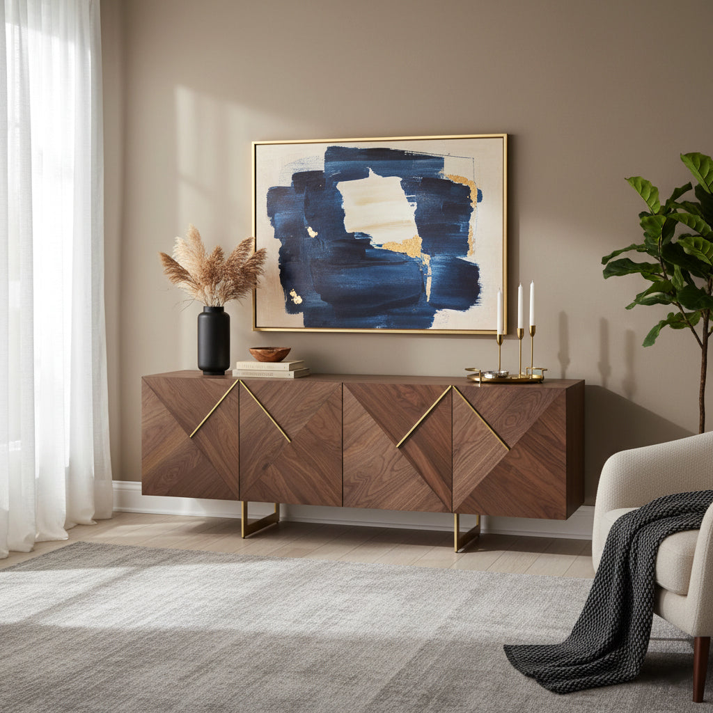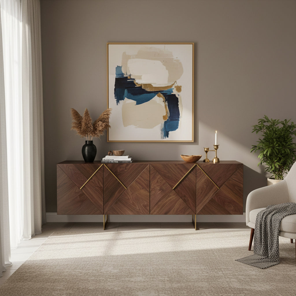 Elevate your living room with our 209cm wide 4 door wooden sideboard, a perfect fusion of style and practicality. This storage side buffet cabinet boasts a spacious interior, offering an organized solution to keep your living space tidy. Crafted from durable mdf wood and supported by chic metal legs, it not only provides ample storage but also adds a touch of modern sophistication to your home decor. With its versatile design, this sideboard is an excellent addition to any living room, offering a sleek and functional storage solution for your everyday essentials.