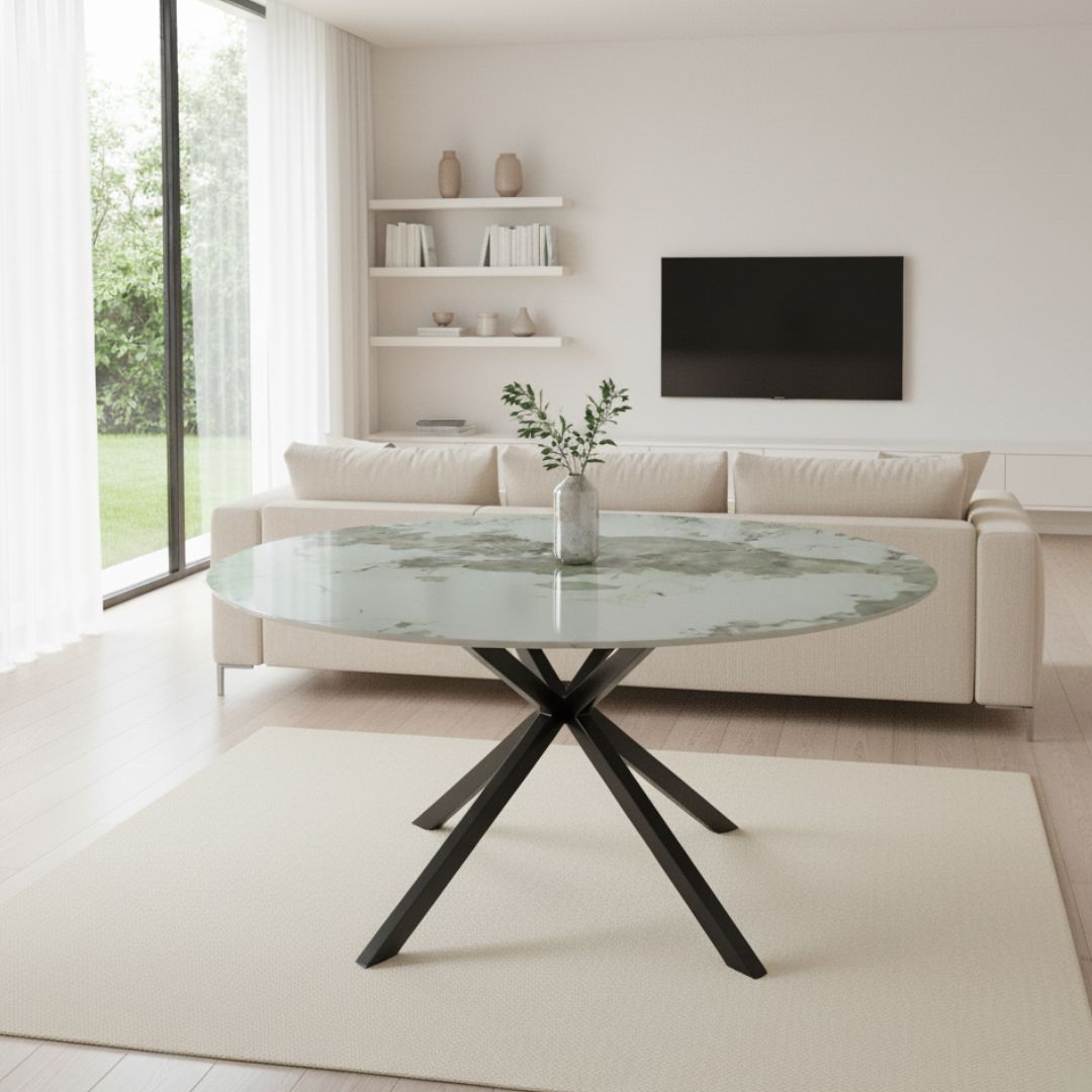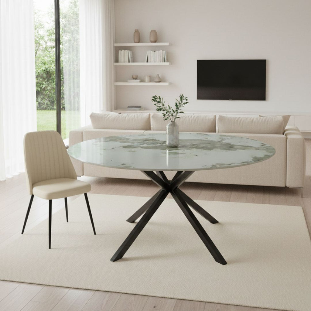 The table features an elegant round cream marble top, providing a luxurious touch and a durable surface for your dining needs.
