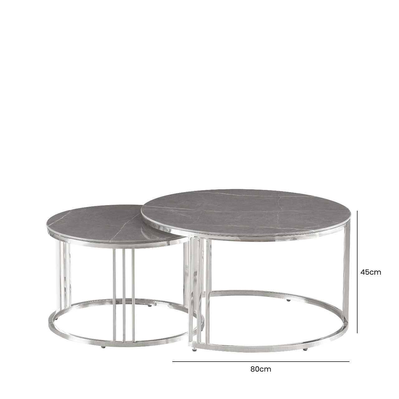 This set of 2 Chrome Metal Coffee Tables features sleek chrome frames paired with grey tabletops, combining modern style with functional design. Perfect for living rooms or lounge areas, they provide versatile surfaces for décor, beverages, or everyday use. The minimalist design complements a variety of interior styles while adding a touch of contemporary elegance.