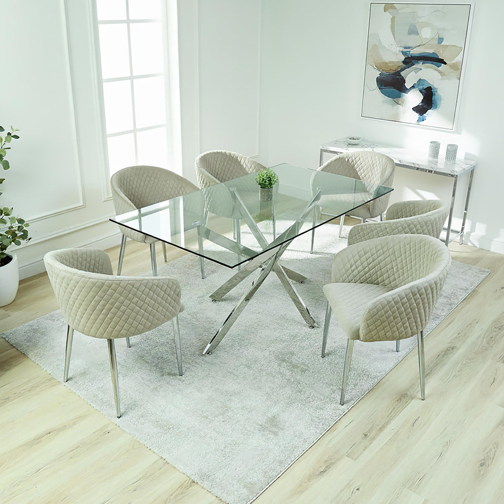 The Andrea Taupe Dining Chair Set with the Davos Large Chrome Dining Table offers a perfect blend of comfort, style, and functionality. This set is designed to elevate your dining experience, providing a luxurious and modern aesthetic that will be the envy of your guests.