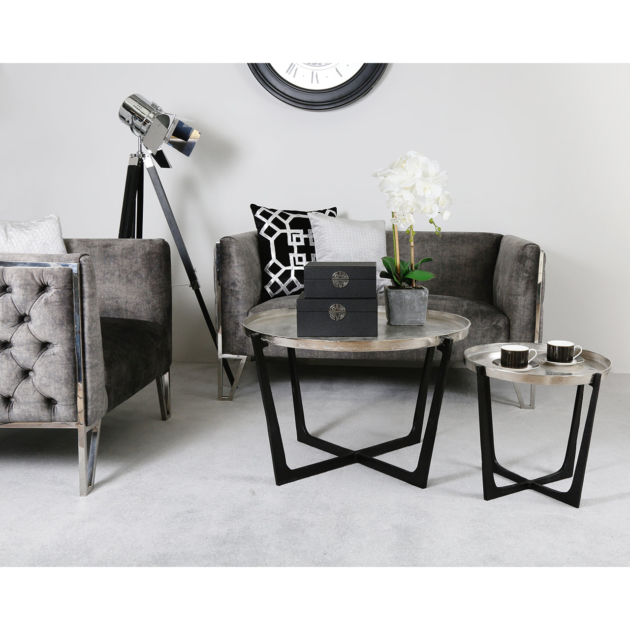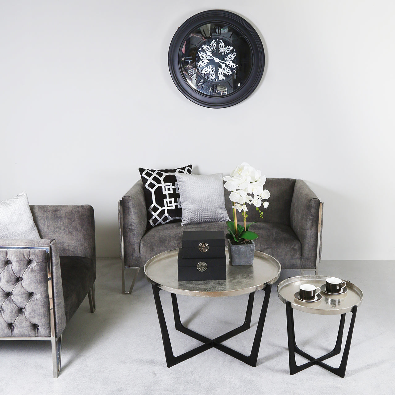 The Set Of 2 Rohan Nesting Tables Black with Nickel Tops features sleek tabletops paired with sturdy frames, combining modern elegance with practical functionality. The nesting design allows for flexible use, saving space when not in use and providing extra surfaces when needed. Perfect for living rooms or lounge areas, these tables add a contemporary and stylish touch to any interior.