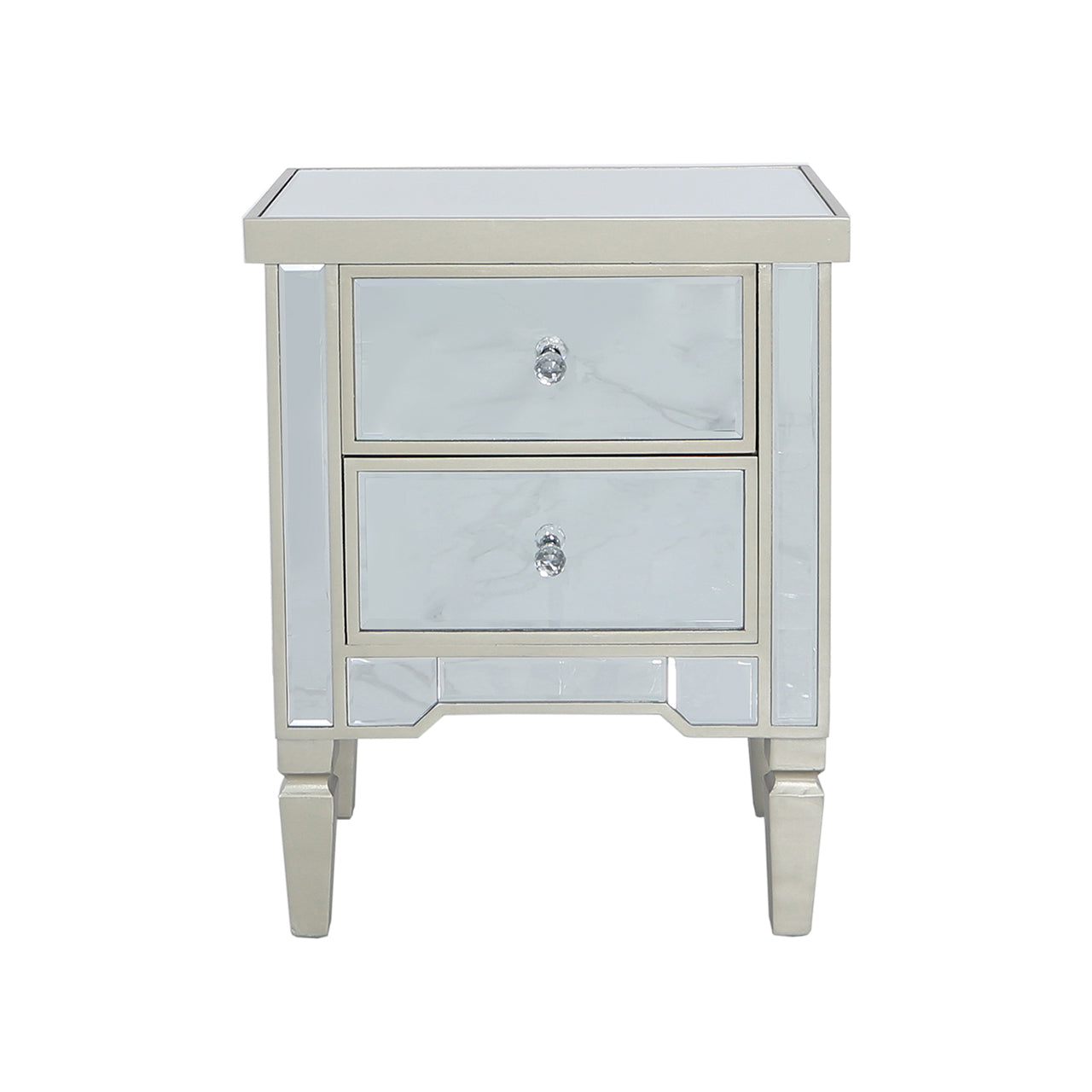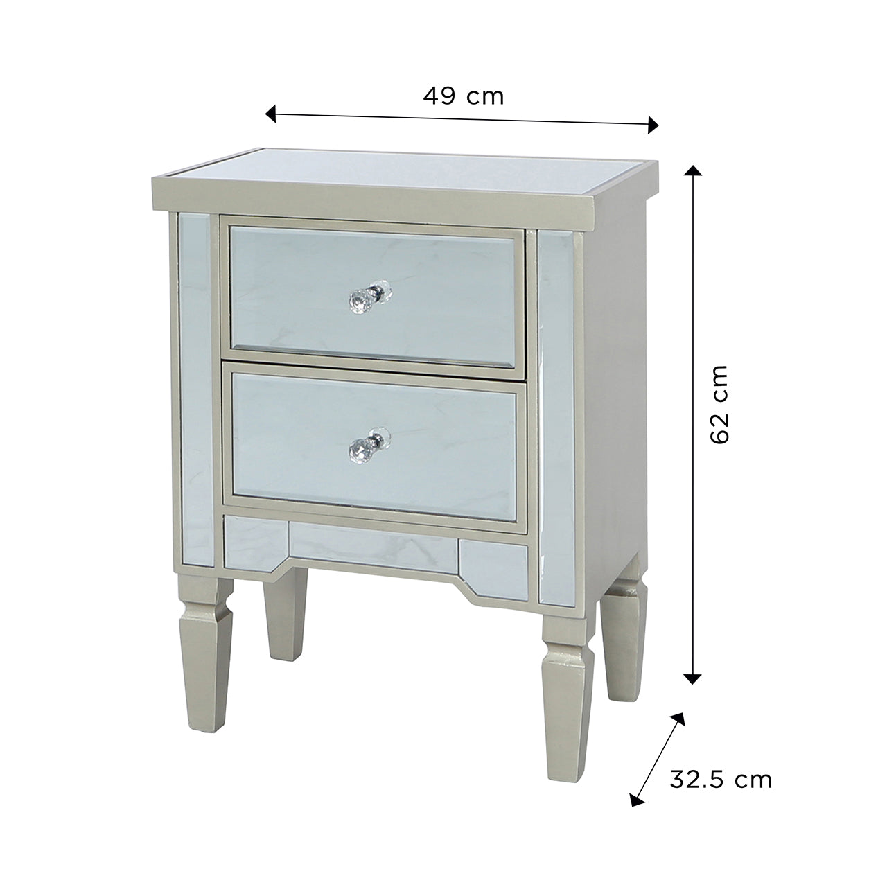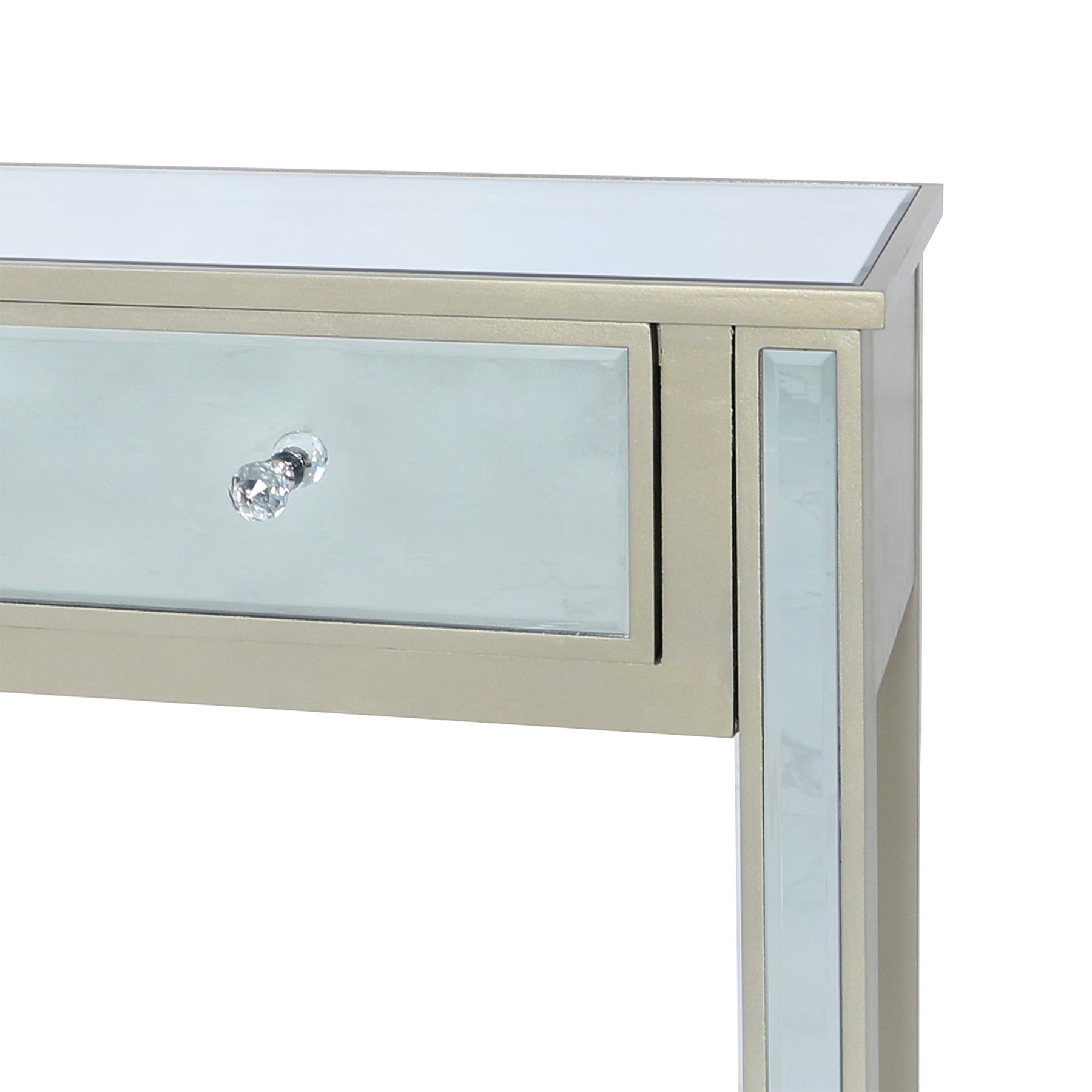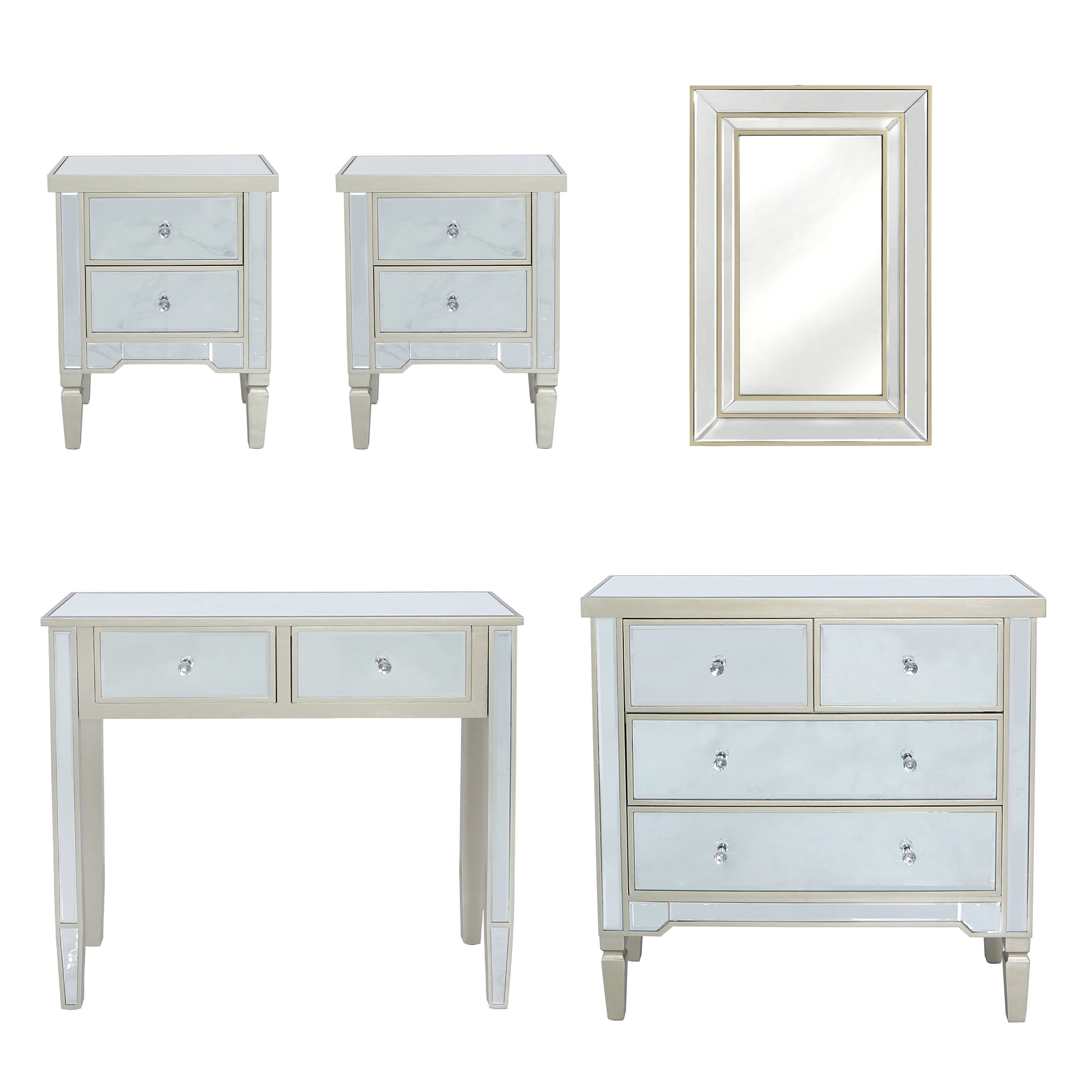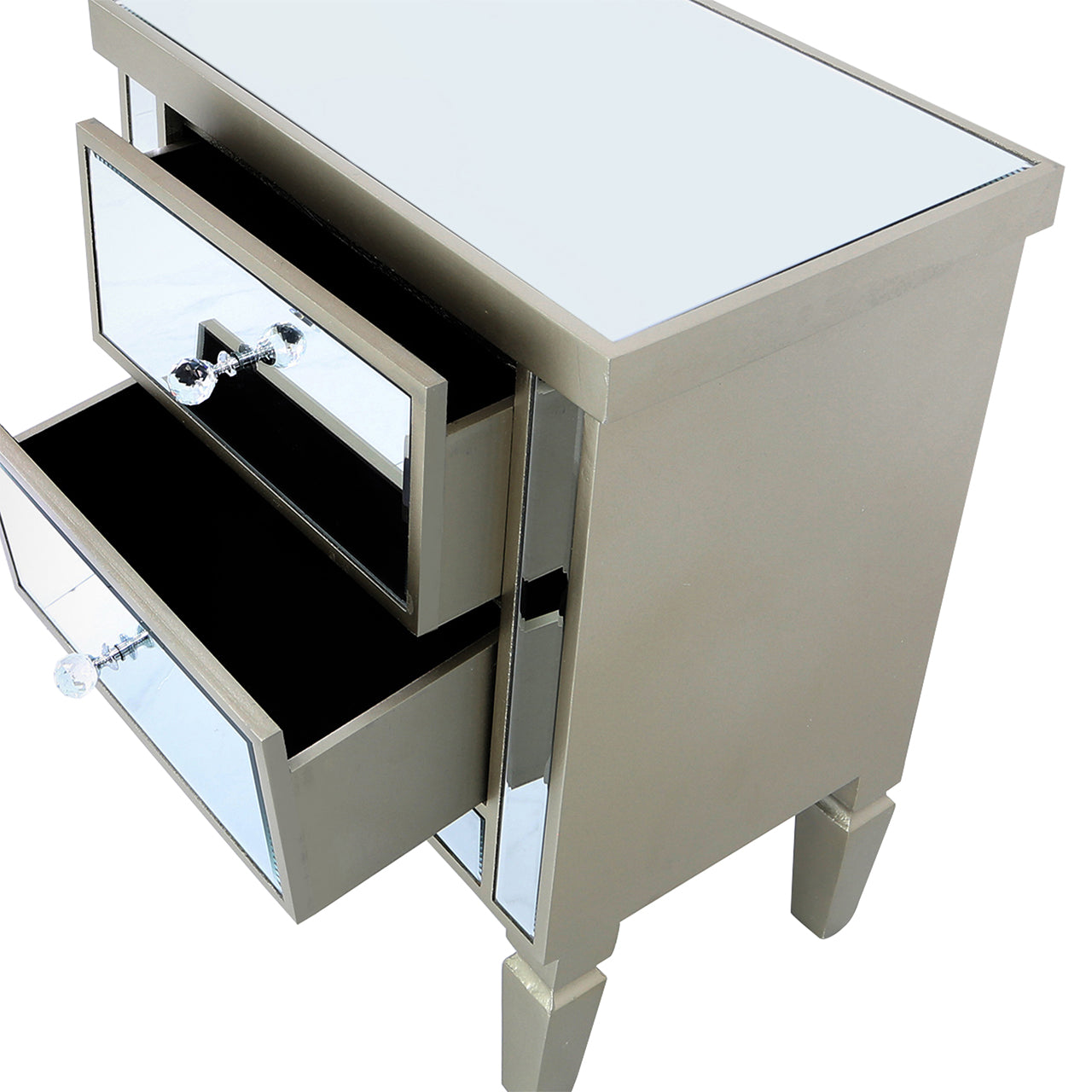 For small spaces and the minimalist design of your bedroom, here is our Treviso Gold Mirrored two pieces bedside tables, a chest of drawers, a console table and a wall mirror with a cozy chick look. It is a mirrored tables and a wall mirror with a glass on top, gold wooden trim, and a crystal handle drawer. These tables and a wall mirror are bright and radiant -- a perfect complement for breezy bedrooms that get lots of natural light