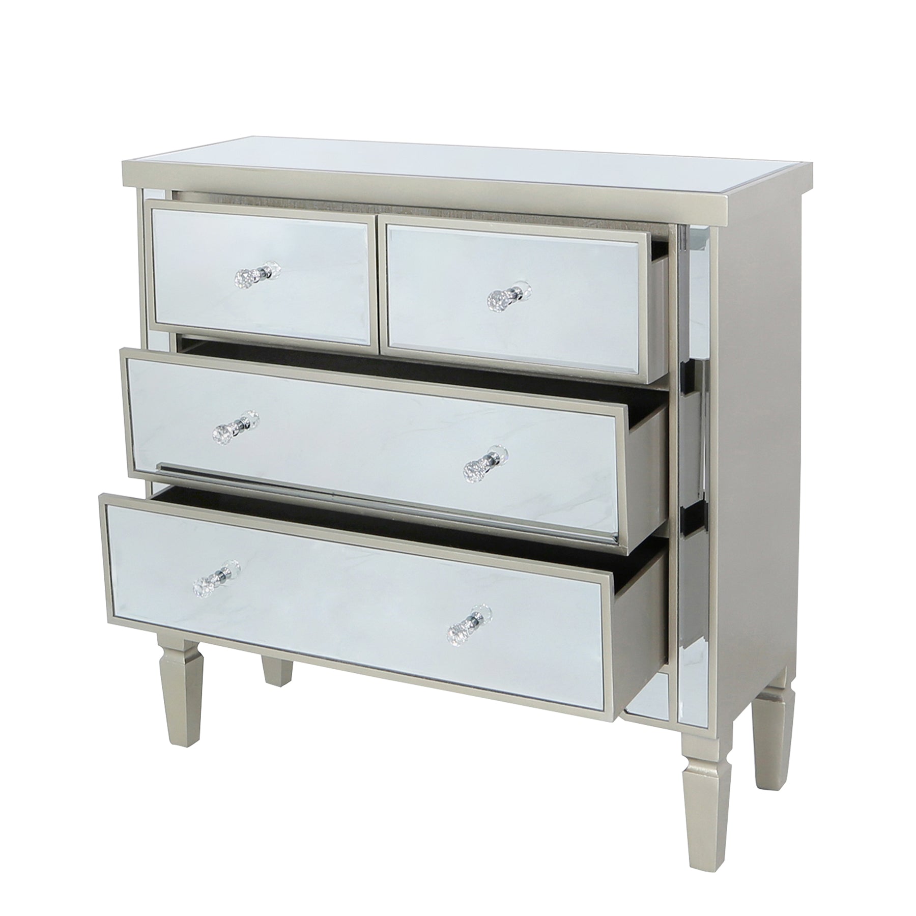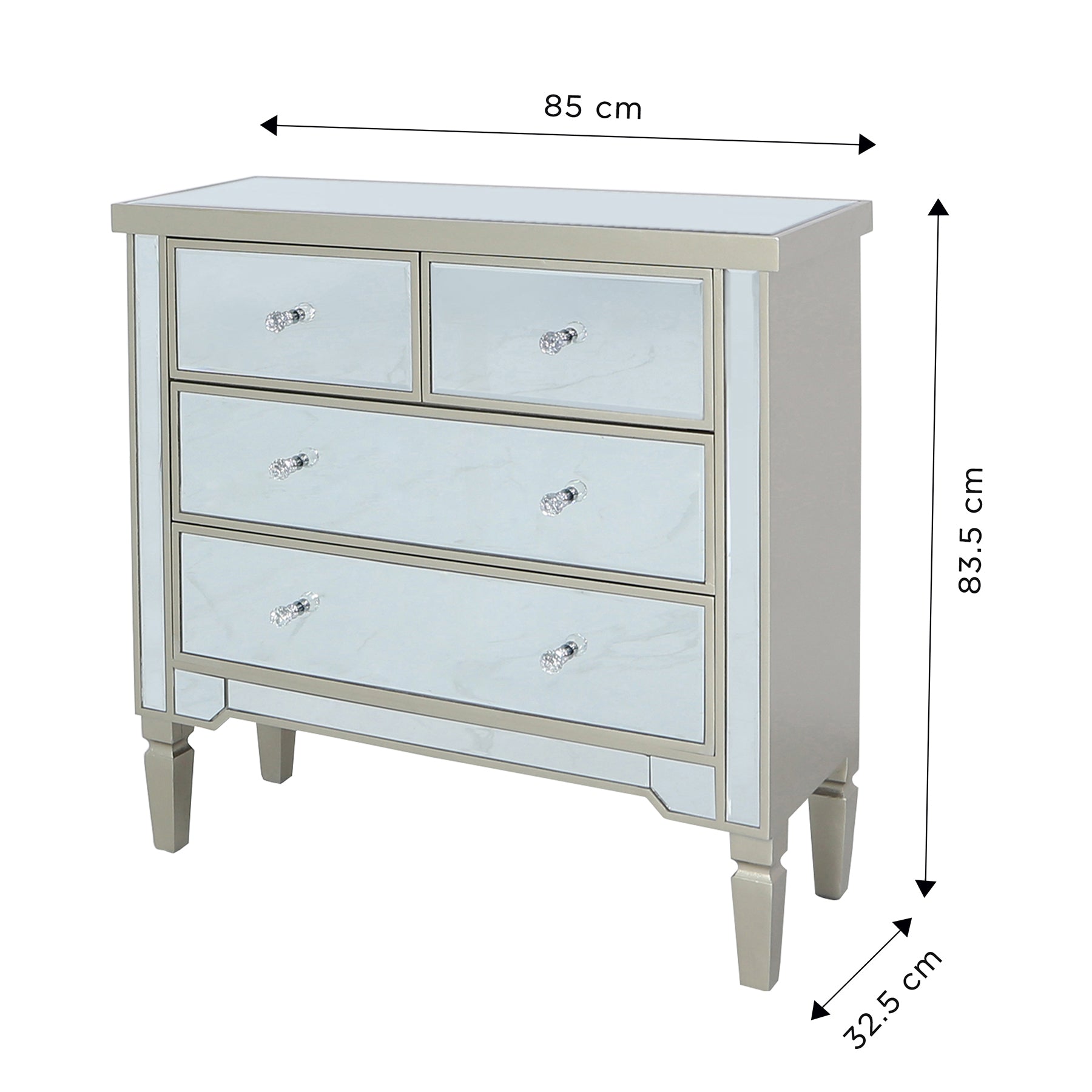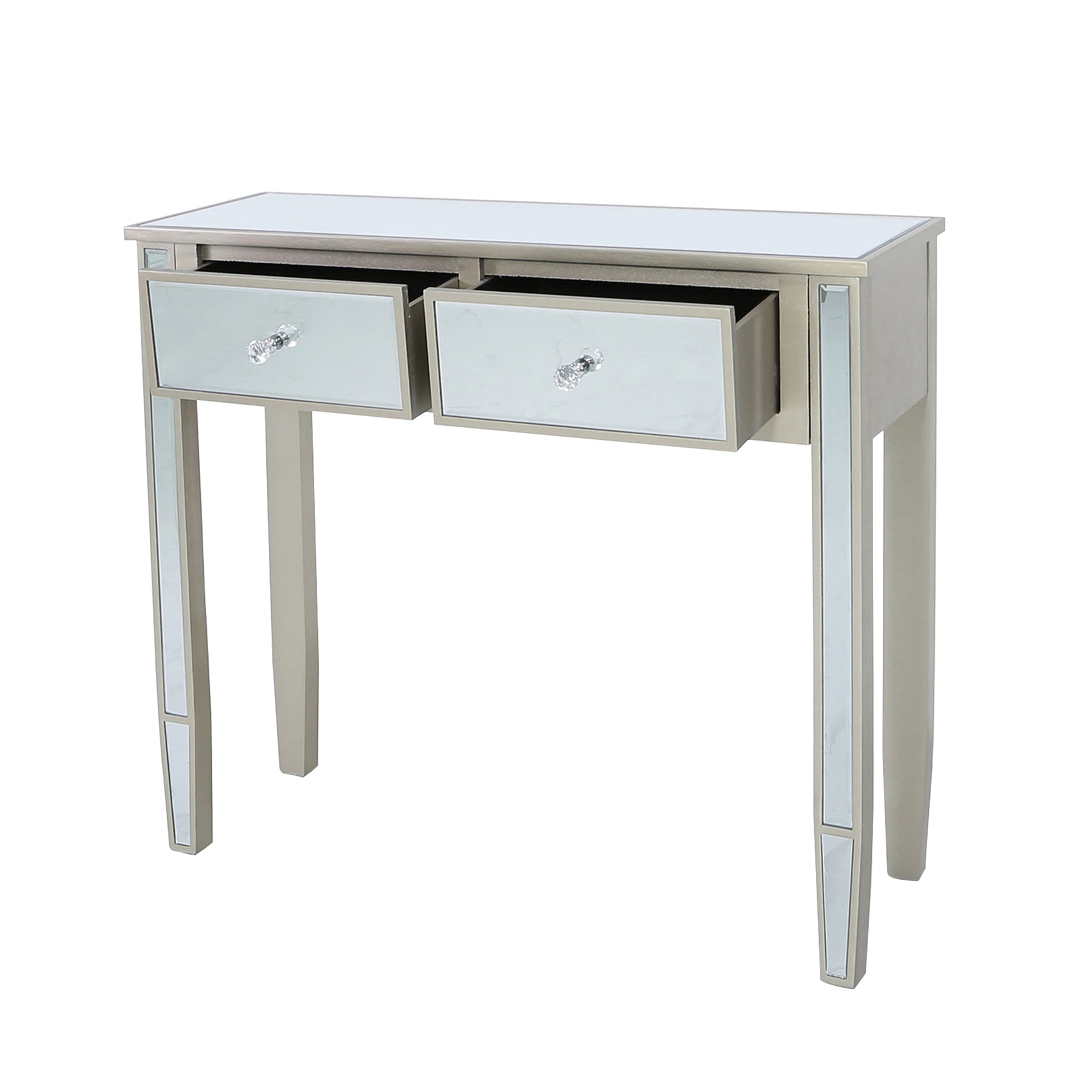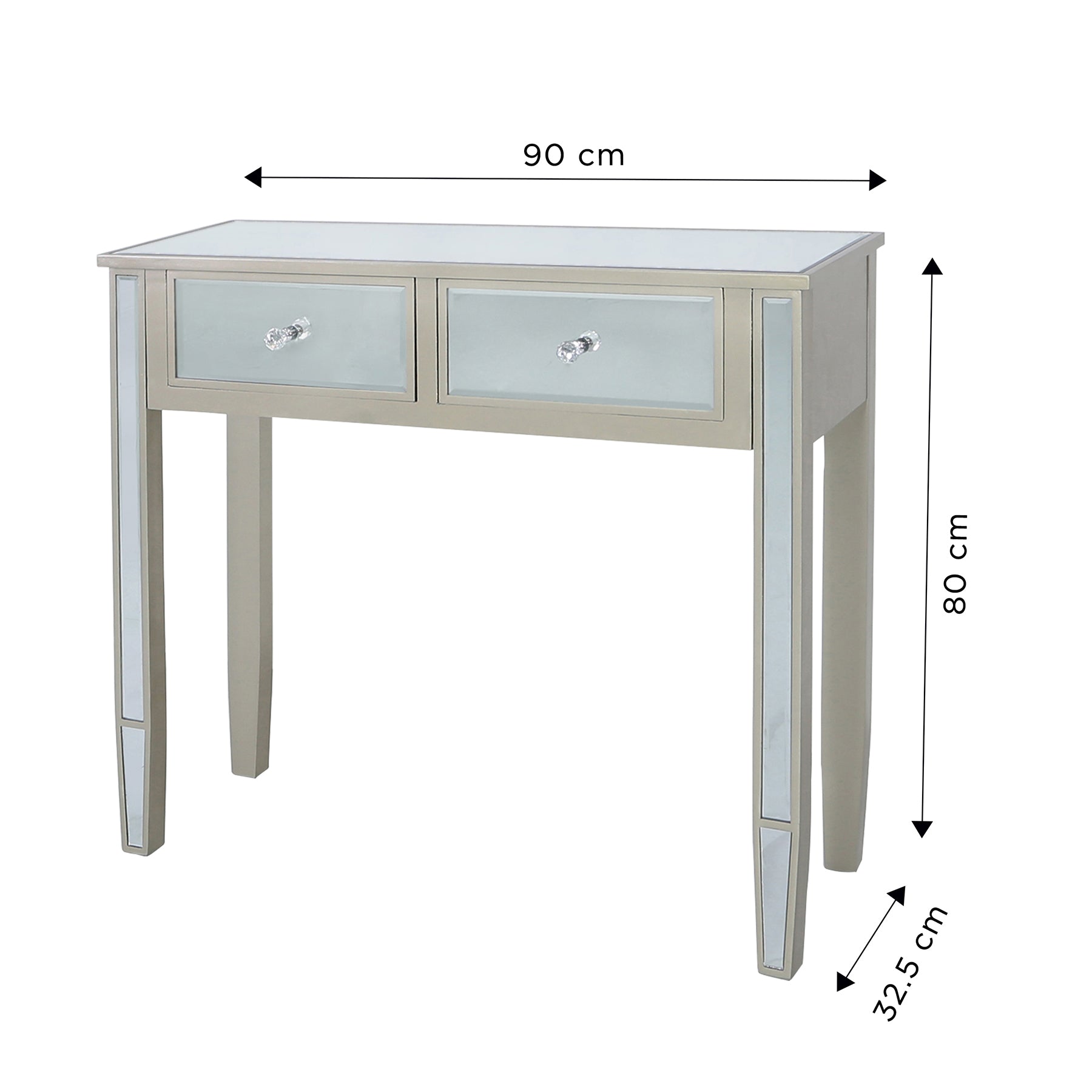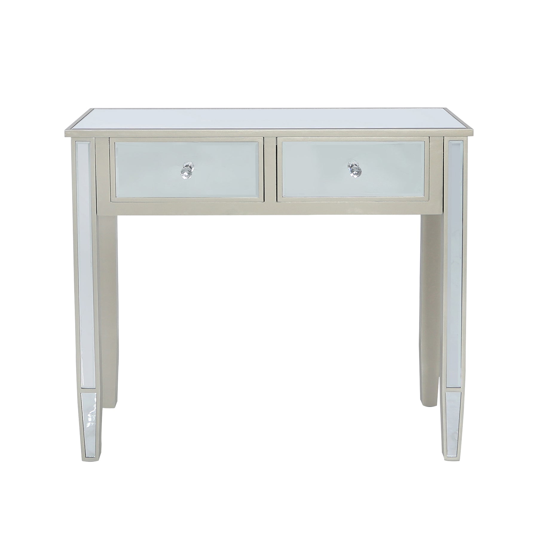 For small spaces and the minimalist design of your bedroom, here is our Treviso Gold Mirrored two pieces bedside tables, a chest of drawers, a console table and a wall mirror with a cozy chick look. It is a mirrored tables and a wall mirror with a glass on top, gold wooden trim, and a crystal handle drawer. These tables and a wall mirror are bright and radiant -- a perfect complement for breezy bedrooms that get lots of natural light