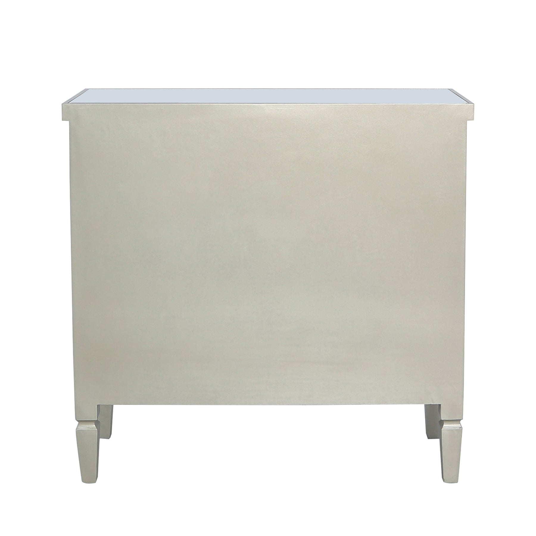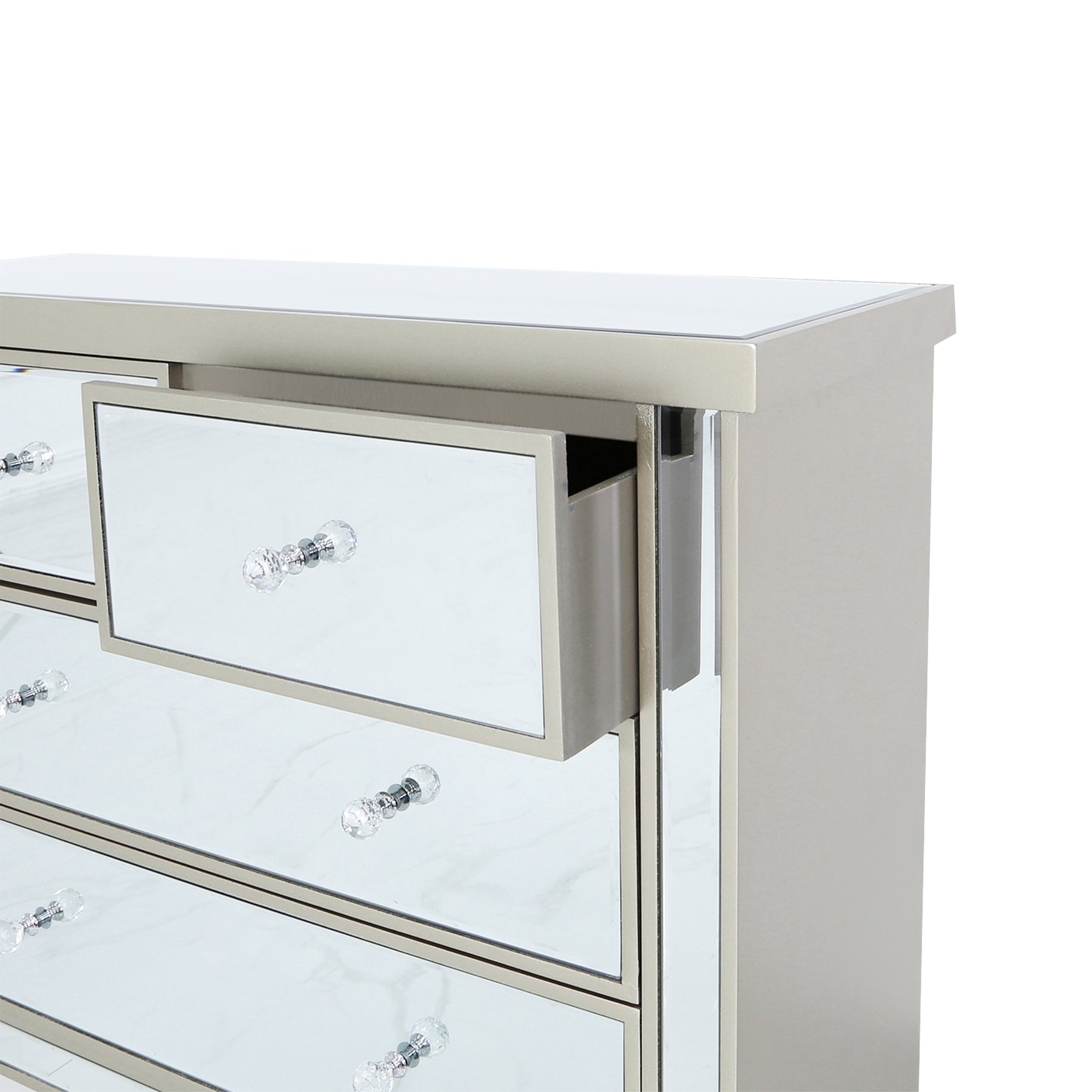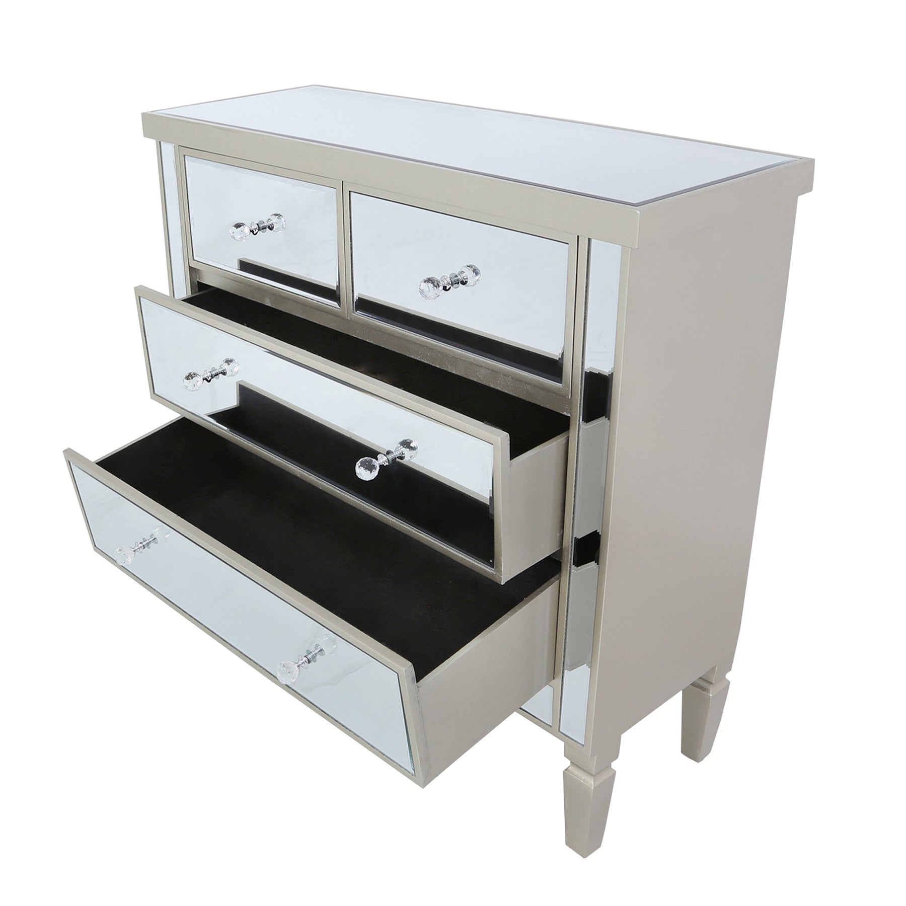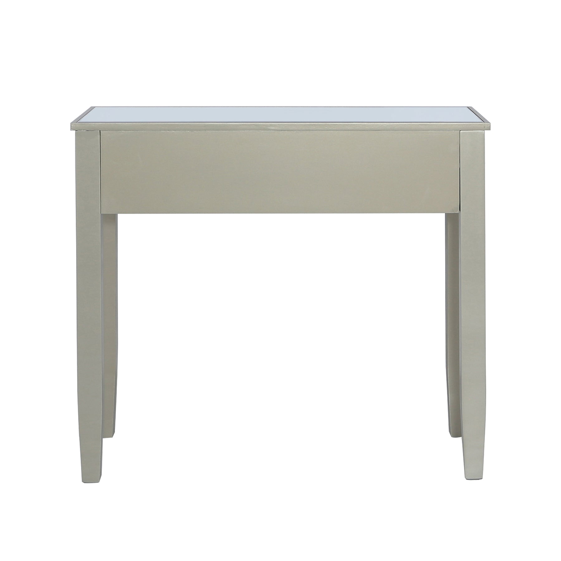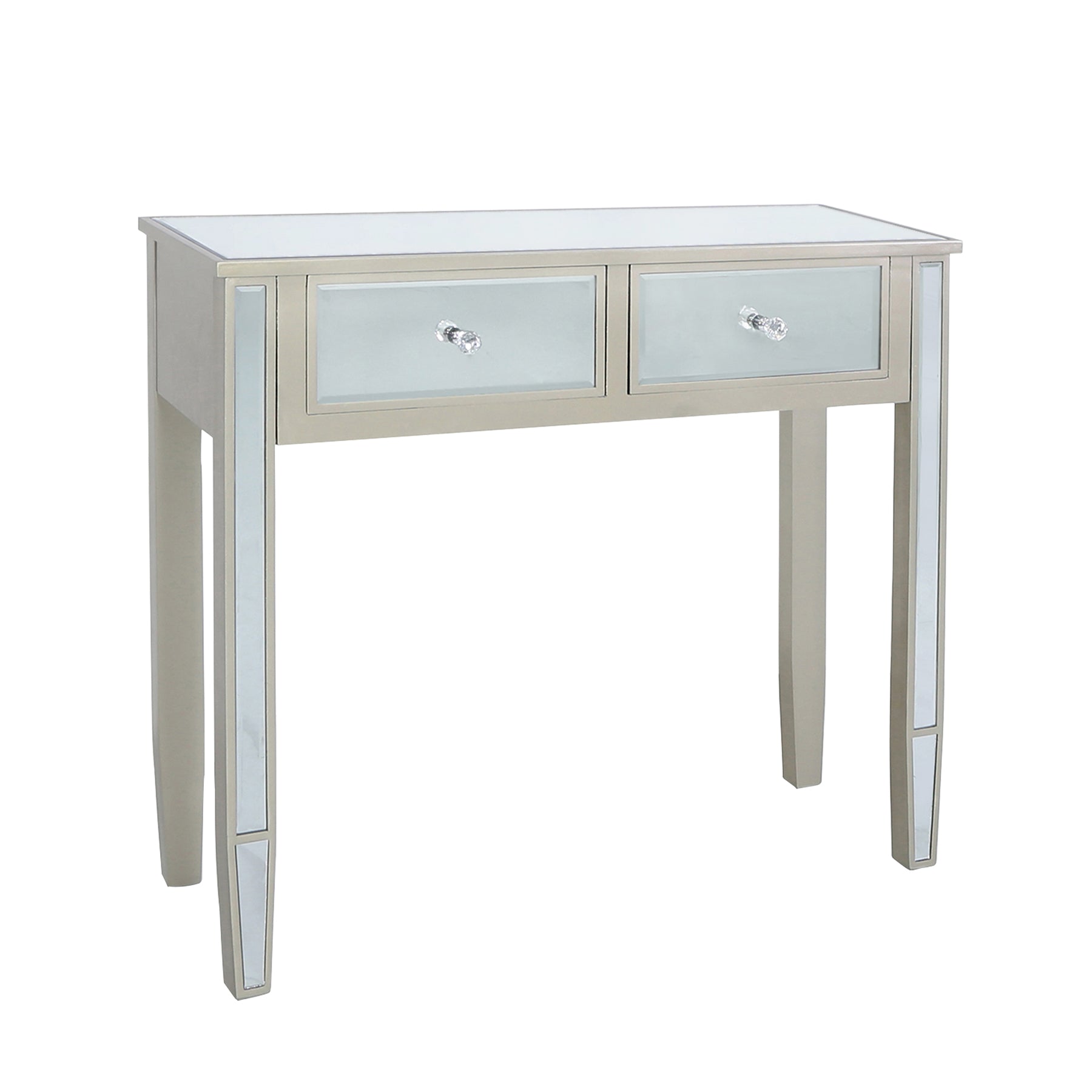 For small spaces and the minimalist design of your bedroom, here is our Treviso Gold Mirrored two pieces bedside tables, a chest of drawers, a console table and a wall mirror with a cozy chick look. It is a mirrored tables and a wall mirror with a glass on top, gold wooden trim, and a crystal handle drawer. These tables and a wall mirror are bright and radiant -- a perfect complement for breezy bedrooms that get lots of natural light