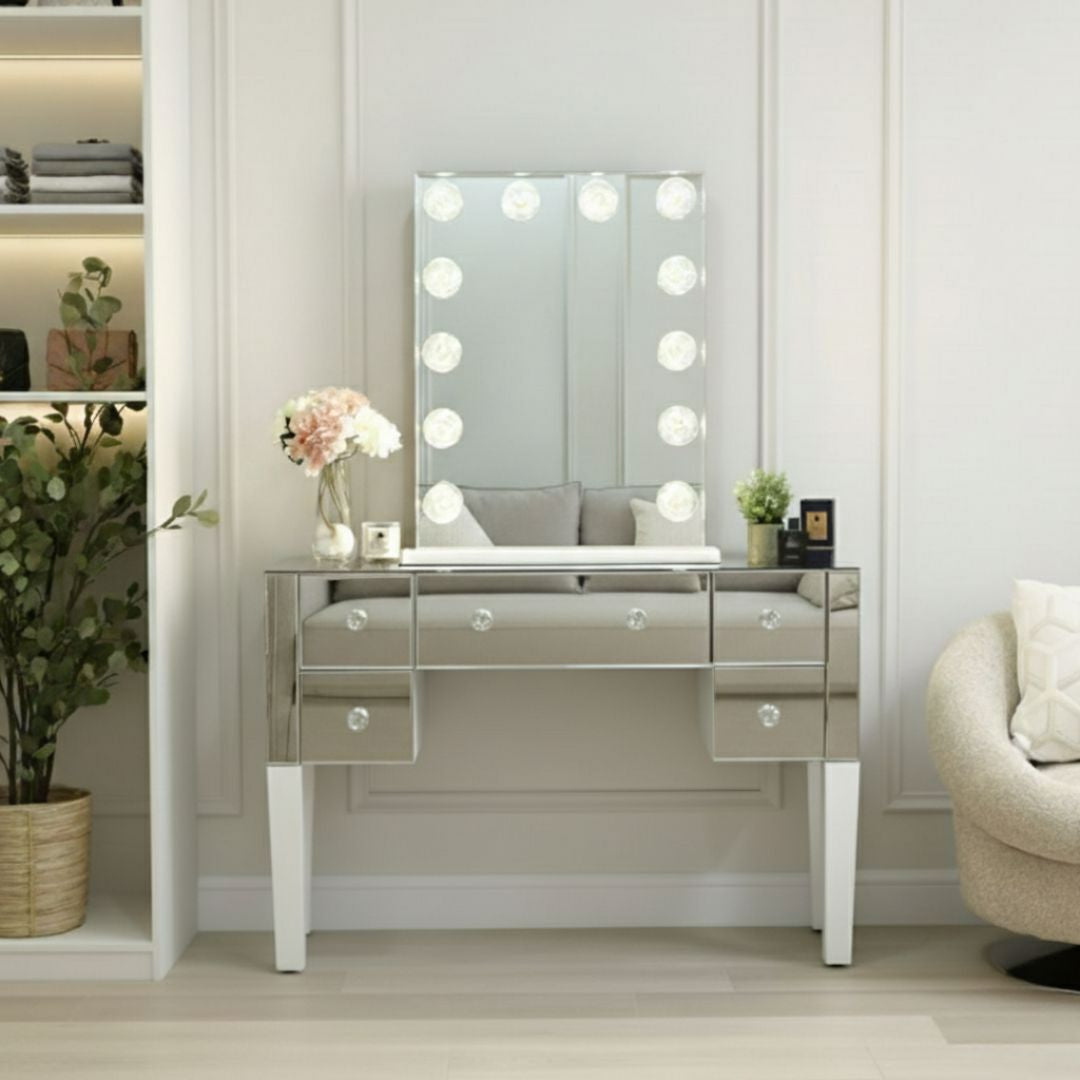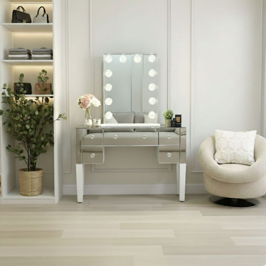 Five Mirrored Drawers Dressing Table With XL Portrait Vanity Mirror with Lights