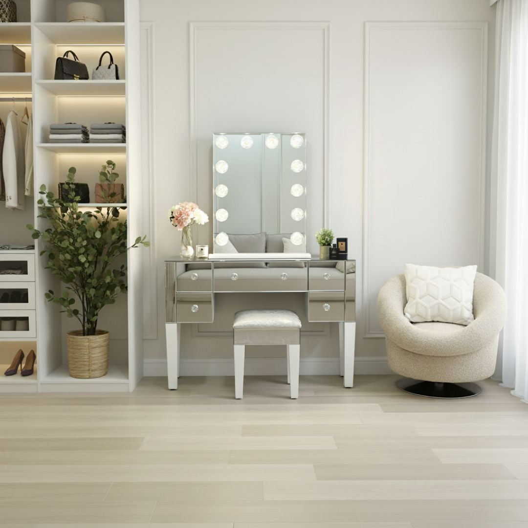 XL Portrait Vanity Mirror with Lights With Five Mirrored Drawers Dressing Table And Stool